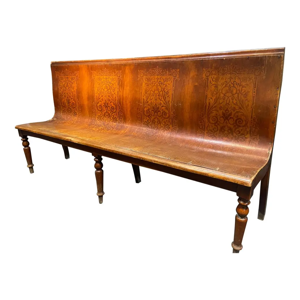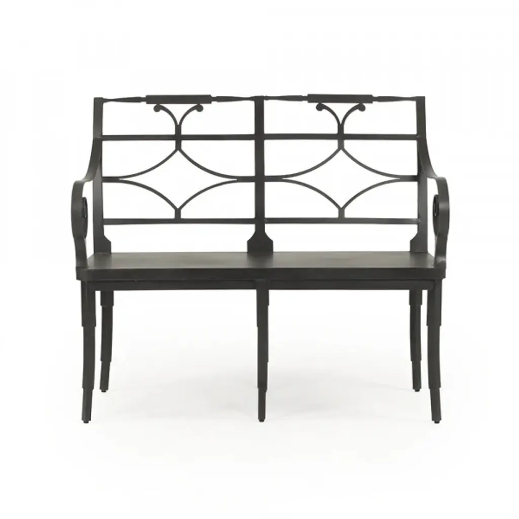 This exquisite bench features a seat in wood and a structure magnificently executed in bronze using the lost-wax technique. The two front legs are in the shape of an eagle portrayed in profile with its wings spread backwards to form the armrests. The back structure, in bronze as well, features a central decoration with two eagles facing each other. The use of bronze and the ancient Roman eagle theme make this piece a timeless, classic piece of furniture.