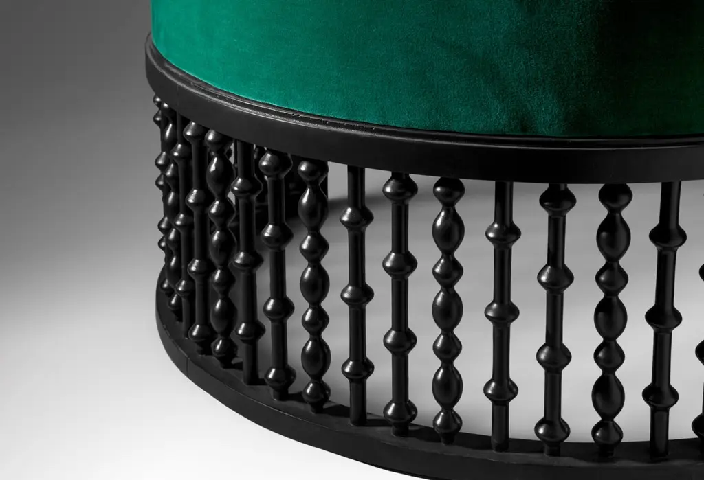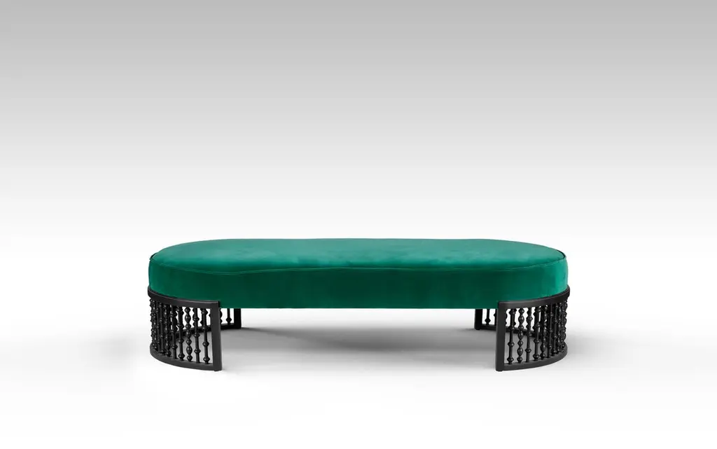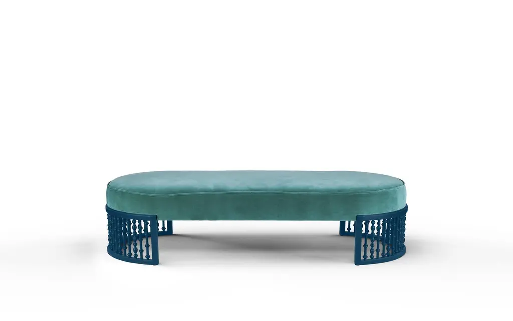 Arabesque-Inspired Bench with Lacquered Wood and Velvet Upholstery.Our Modern Meets Heritage bench design nods to traditional Islamic craftsmanship. Its legs are arabesque-inspired and beautifully grooved to reflect our heritage, and matched with a smooth velvet upholstery for an elegant twist. Can be custom made in any color with matching fabric.