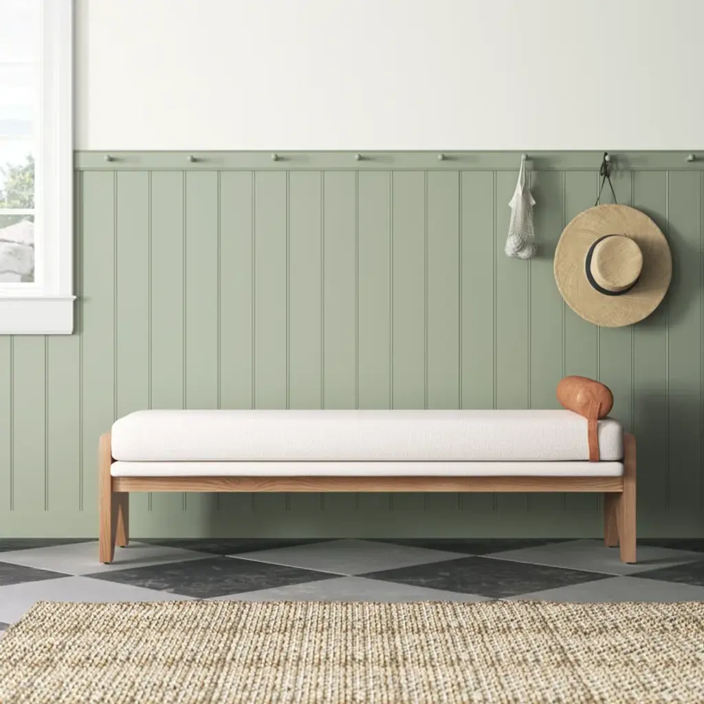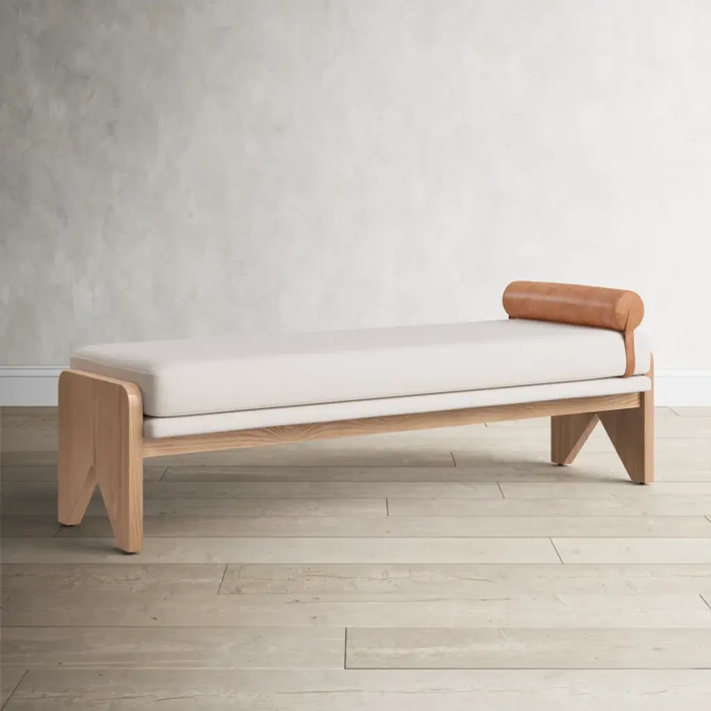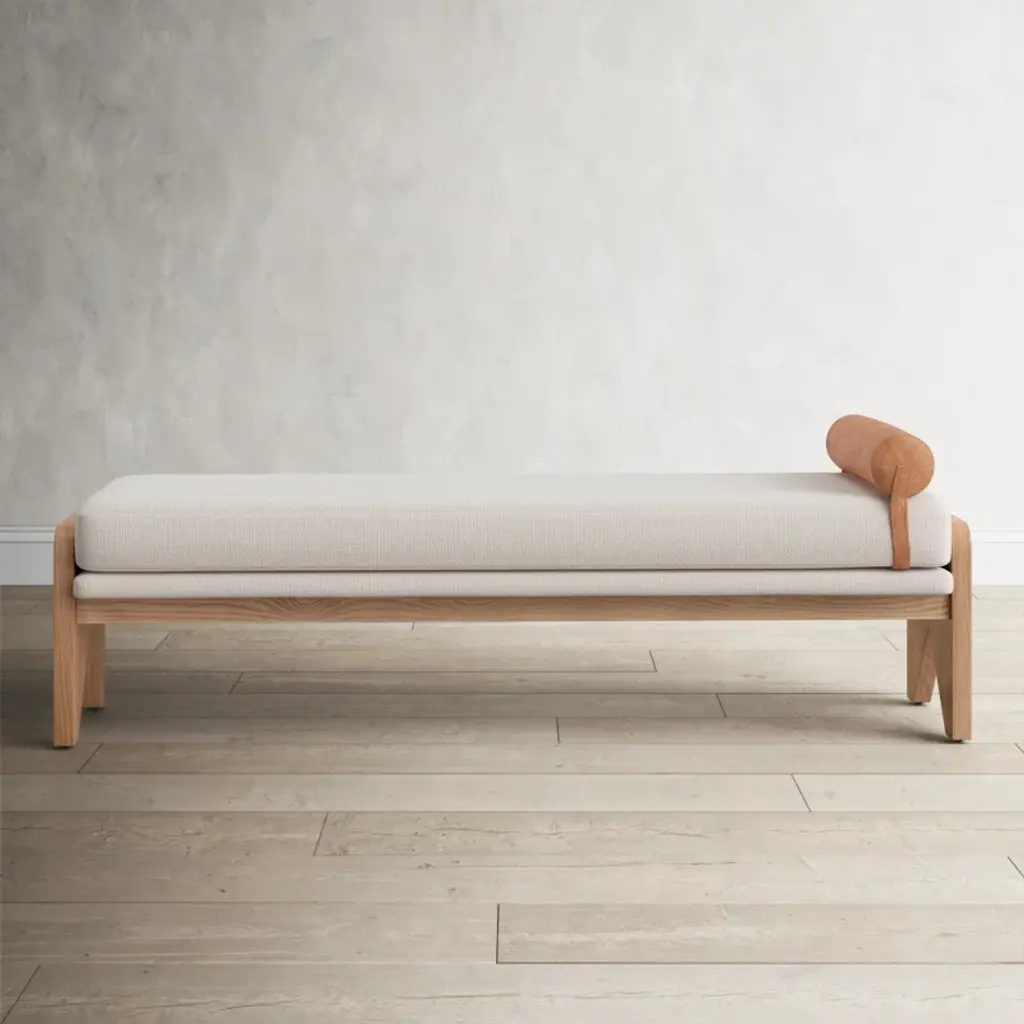 Crisp white performance fabric places a sensible twist on streamlined bench styling. A solid ash base with cutout sides adds a detail-driven finishing touch with mid-century vibes.