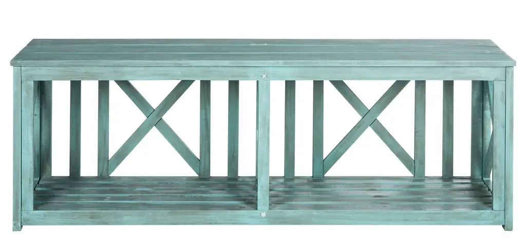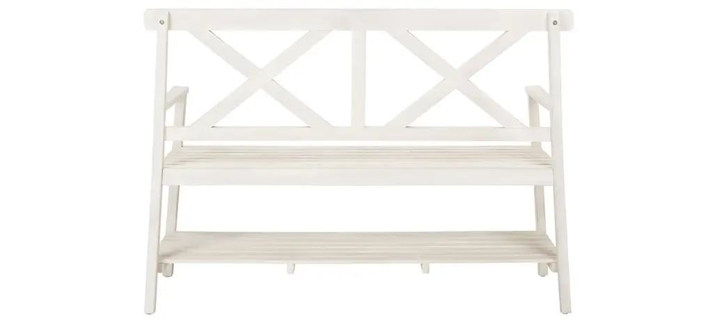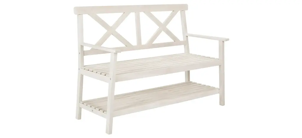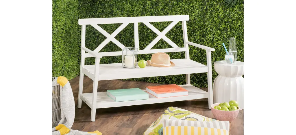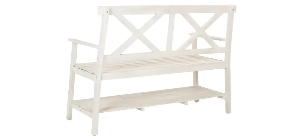 Transform any outdoor area into a luxe retreat with this white 49.21 inch outdoor bench. Inspired by the outdoor furnishings used at New England's top bed and breakfast, its classic design is crafted with acacia wood and features ample storage underneath.