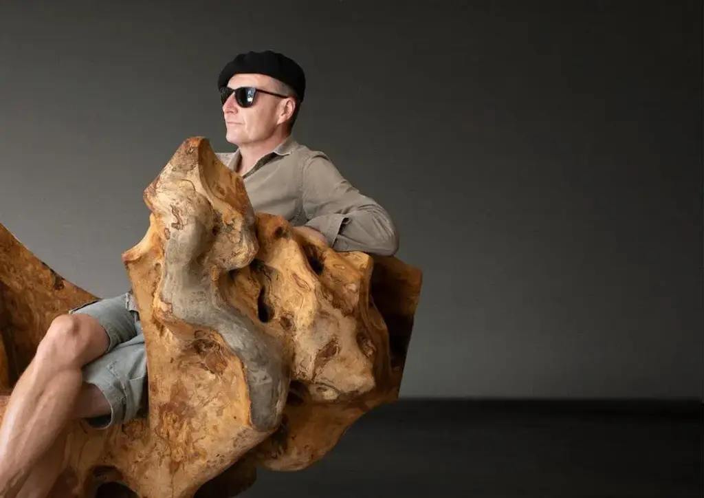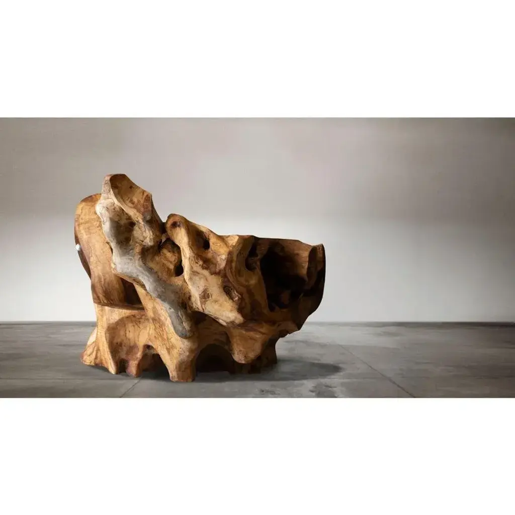 Ariadna bench by woody fidler materials: olive wood dimensions: w 150 x d 100 x h 105 cm woody fidler feels honored to live in a country where olive growing dates back to 4000 bc, as documented in minoan civilization. Deep love for the earth and deep respect for olive trees is the main reason why the artist realized the degree of waste during the extraction and use of wood. The experience gained gives him reason for his work. Sculptural furniture is made of recovered trees, damaged by the weather or human activities. The works created by the artist are born from a creative dialogue with the material from which he creates sculpture furniture. Everything starts and ends in the tree. The olive tree inspires the artist's search. Shapes, holes, cracks and the passage of time lead to a carefully selected design. Gives these trees a new life.