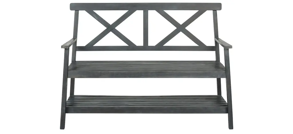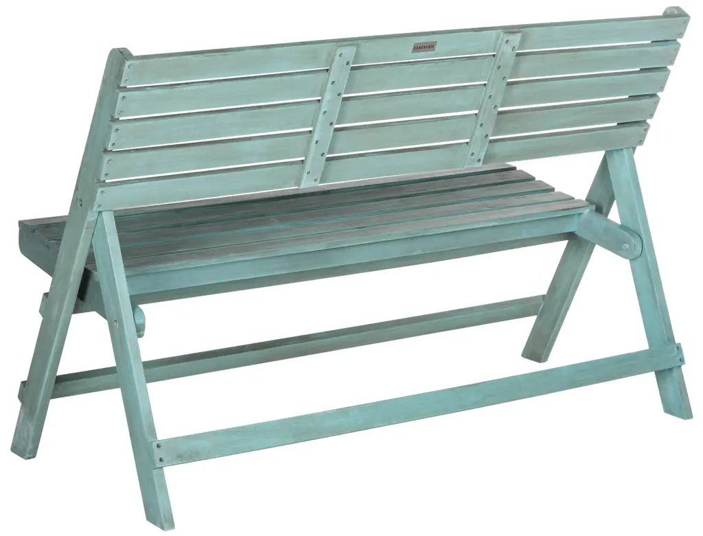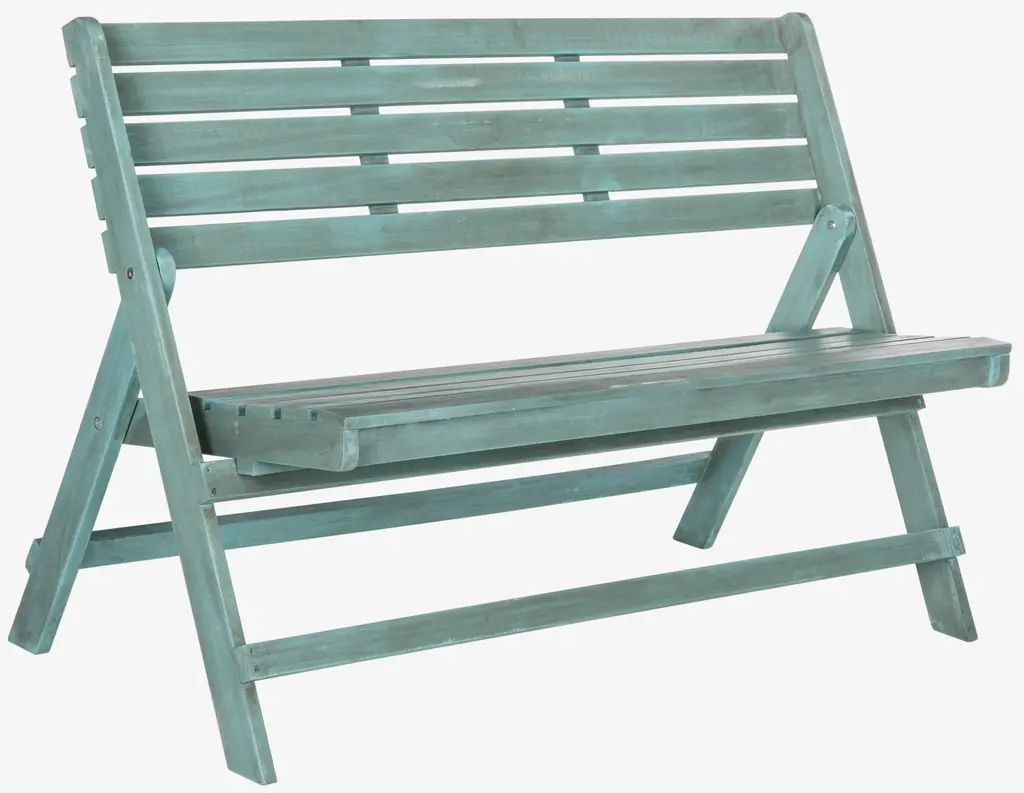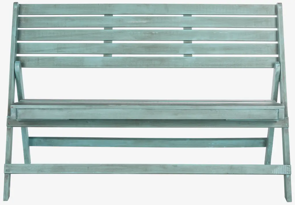 Create a urban oasis with the sleek, clean lines of the folding Bench in beach house blue finish. it's organic-style acacia wood and galvanized steel make it a natural choice for a relaxing escape and it's clever folding capability makes it perfect for entertaining. Store outdoor furniture indoors or cover well when not in use. Remove wooden furniture from standing water. Dust regularly with small brush or vacuum. Spills should be taken care of immediately before they harden or stain with a slightly dampened sponge. Do not use bleach solutions. Some assembly required.