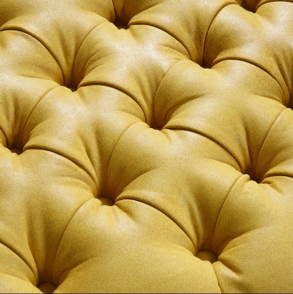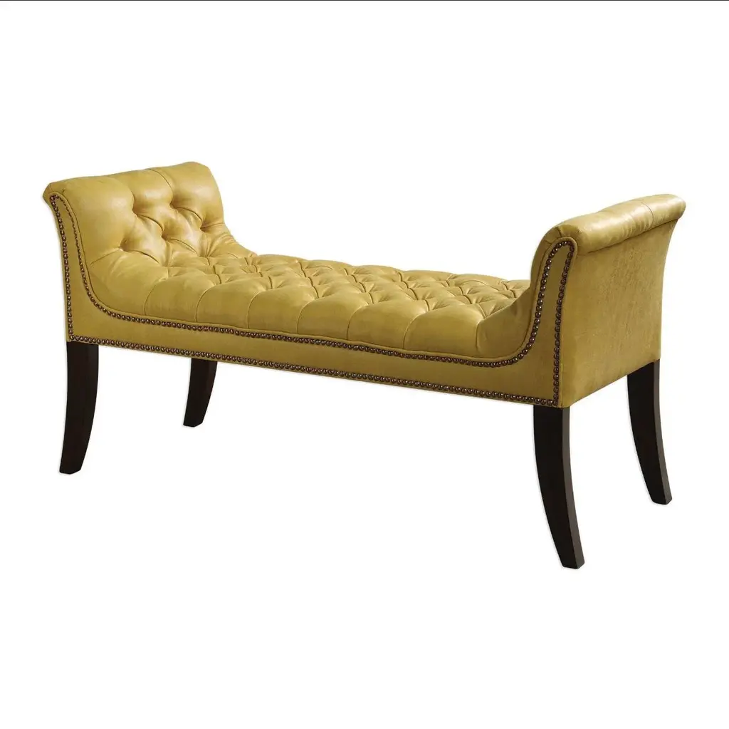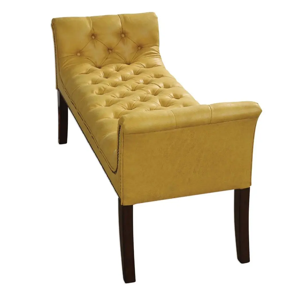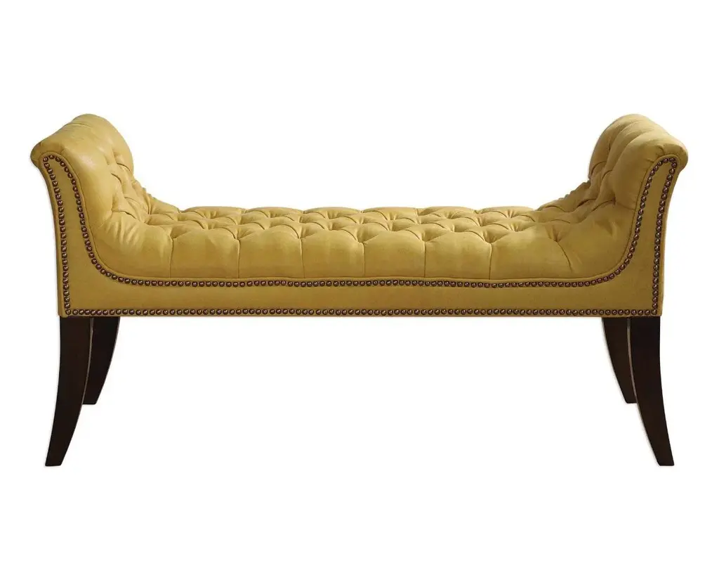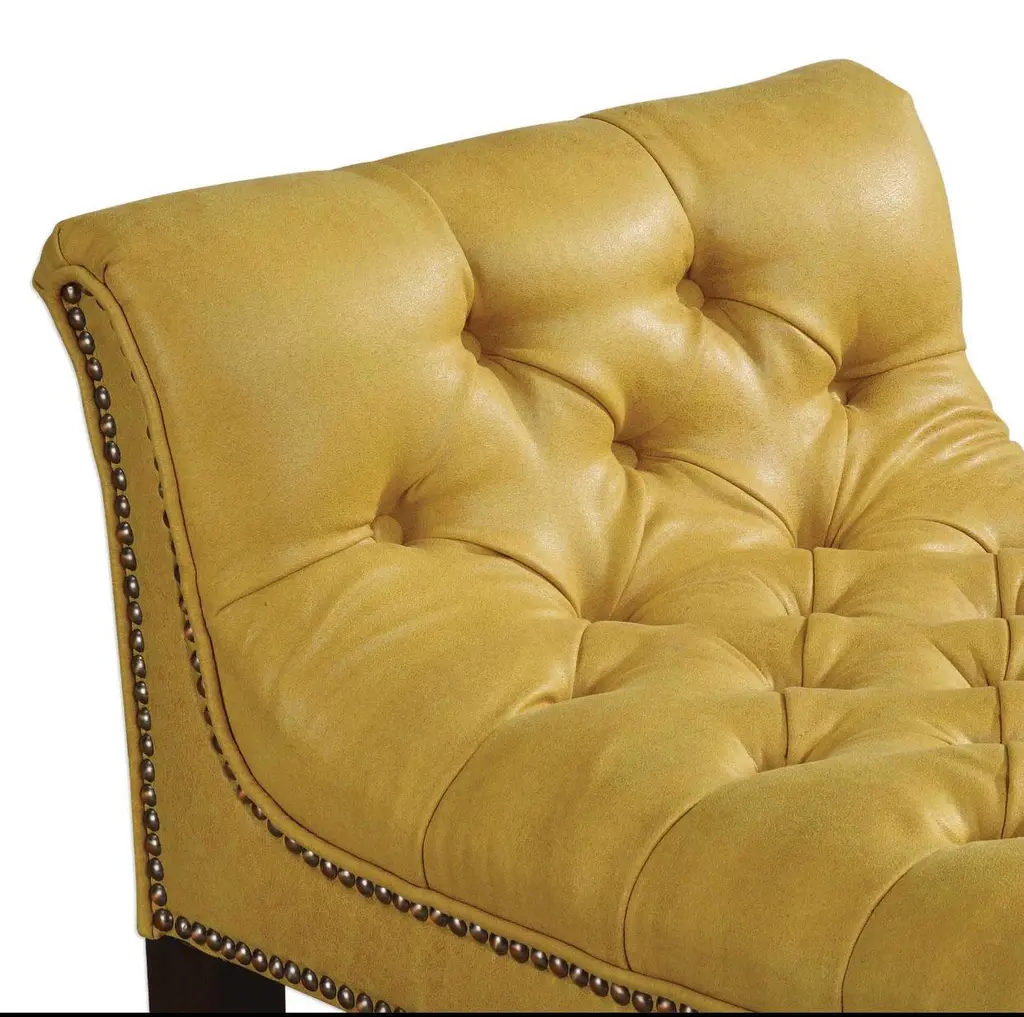 Oh my gosh I want this! Mustard- the new 'it' color. Gracefully designed with gently sloping arms in an energizing distressed Mustard color leather-like fabric; tufted seat is accented with brushed nickel nail head trim, the legs are Birch and stained a dark espresso.