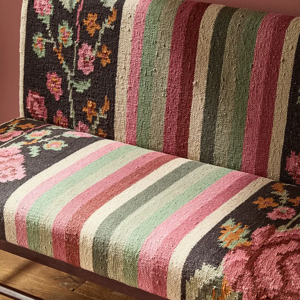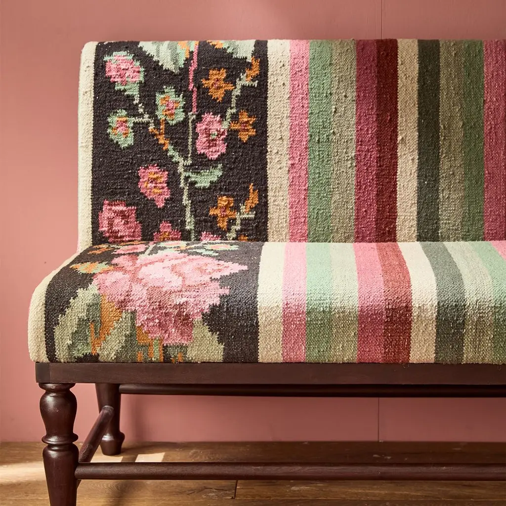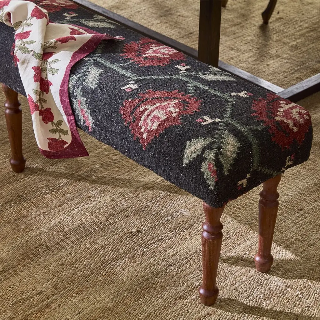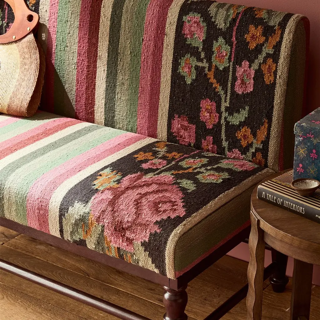 Design is in the details. Turned wood legs, an espresso base, and a floral kilim weave are testaments to the skilled craftspeople behind this FSC®-certified banquette.