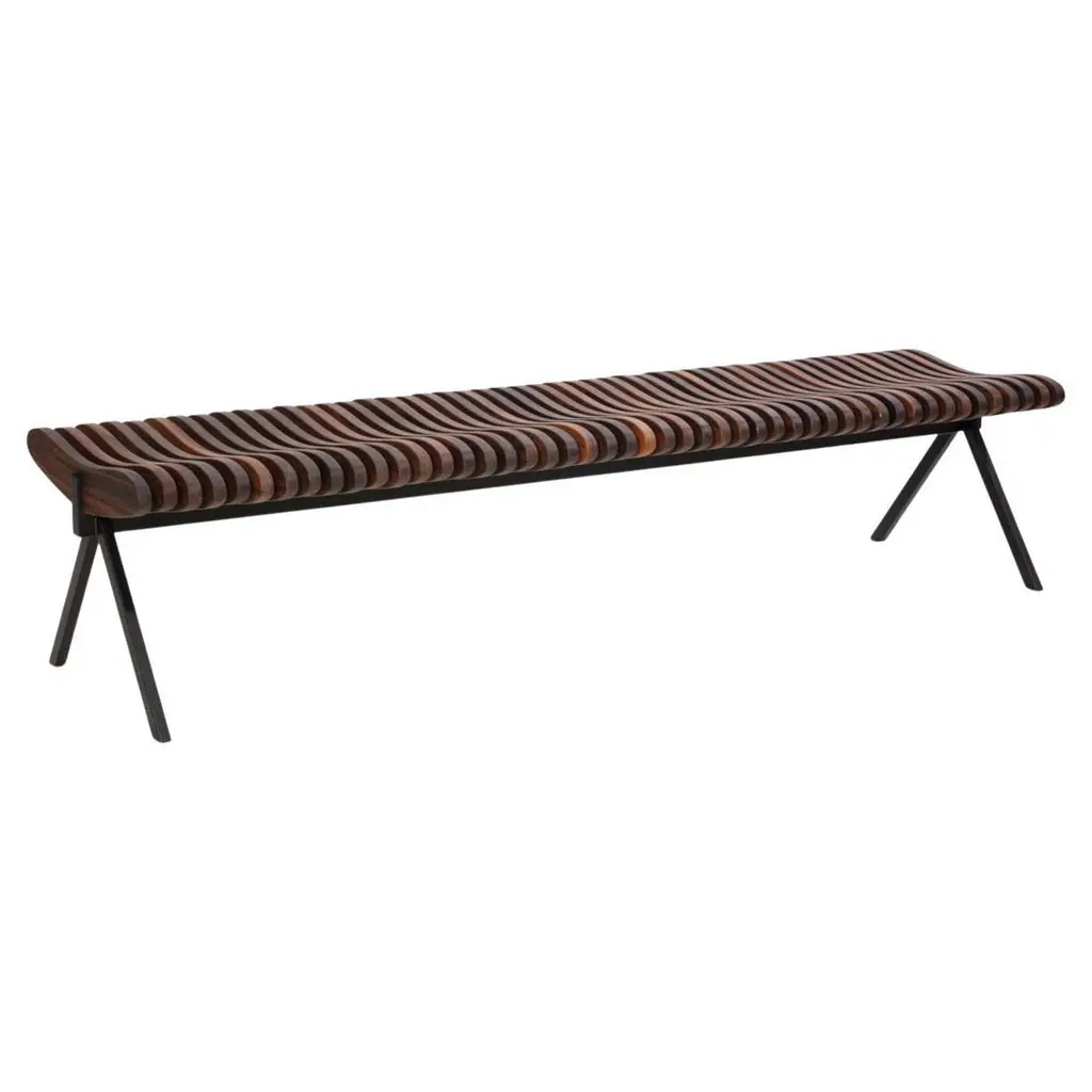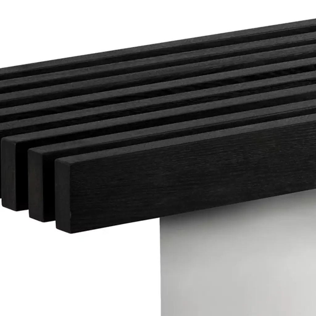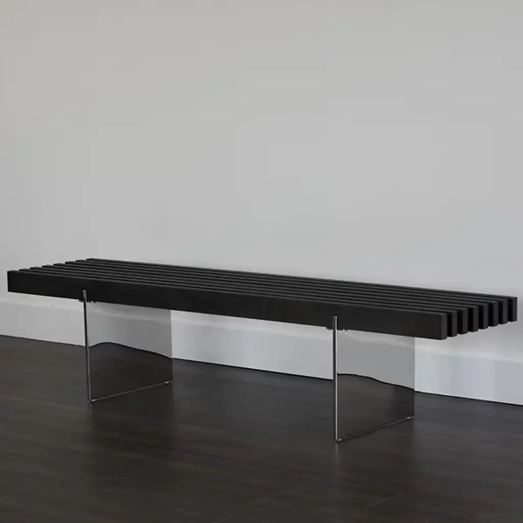 The Atticus Bench from Sunpan suspends ash wood slats between polished stainless steel legs for clean linear seating. The extended length accommodates multiple users while maintaining minimal visual weight through the elevated design approach. Solid ash construction provides natural wood grain patterns that contrast with the reflective metal supports beneath. Each slat runs parallel to create rhythmic spacing that allows light to filter through the bench structure. The generous width works well for both residential and commercial applications requiring substantial seating capacity.