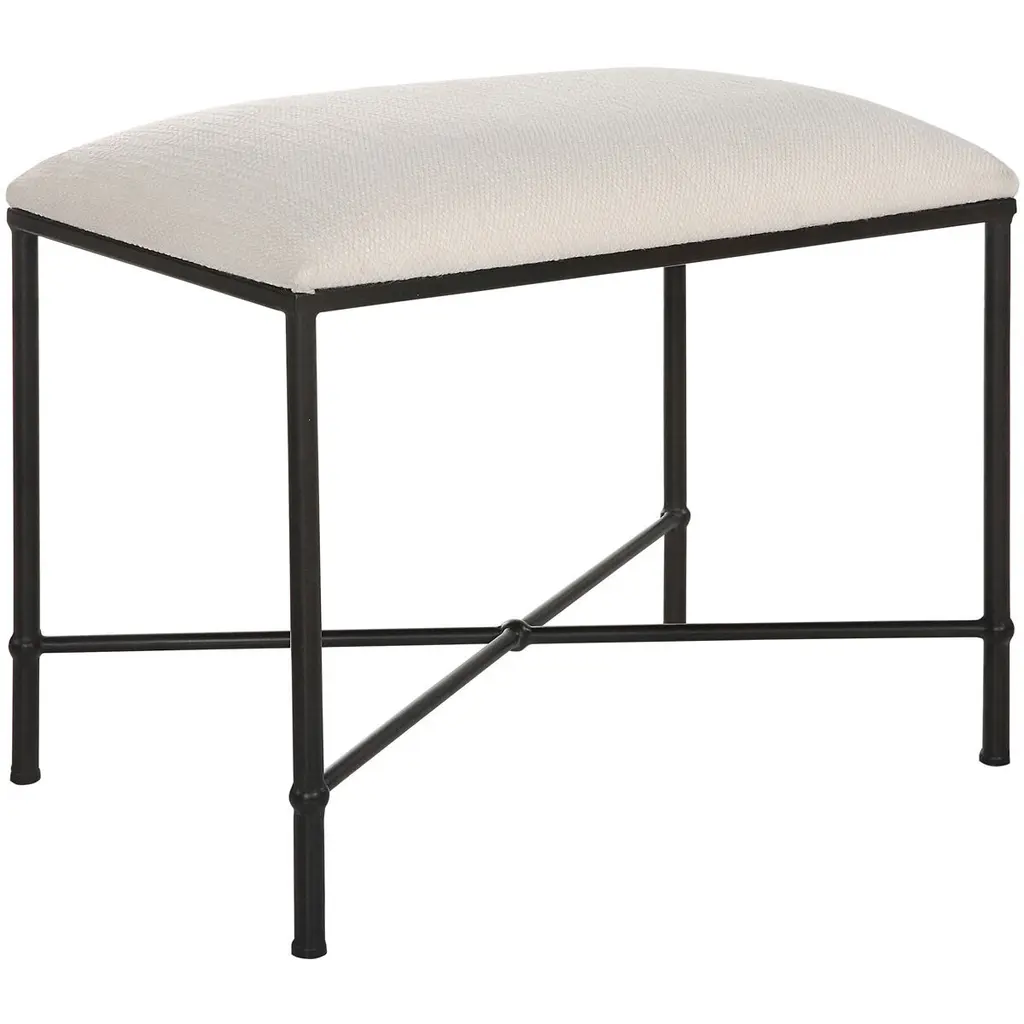 Thoroughly Modern Yet Inspired By The Classics, This Small Bench Displays A Stylish Black And White Look Featuring An Iron Frame In A Satin Finish, Upholstered In A Crisp White Textured Fabric.