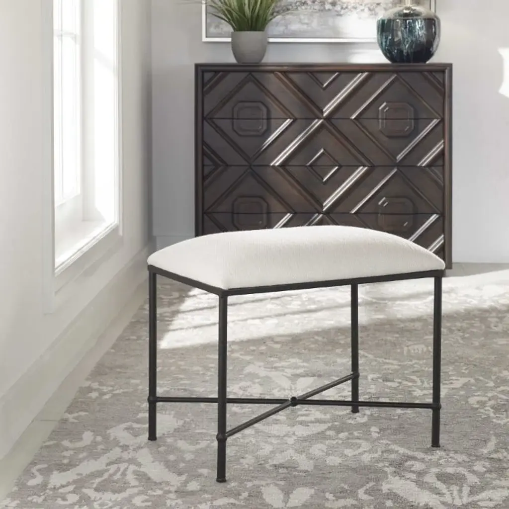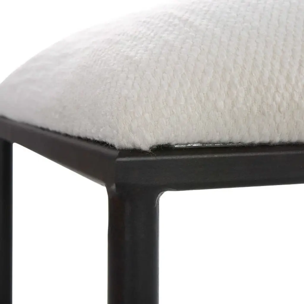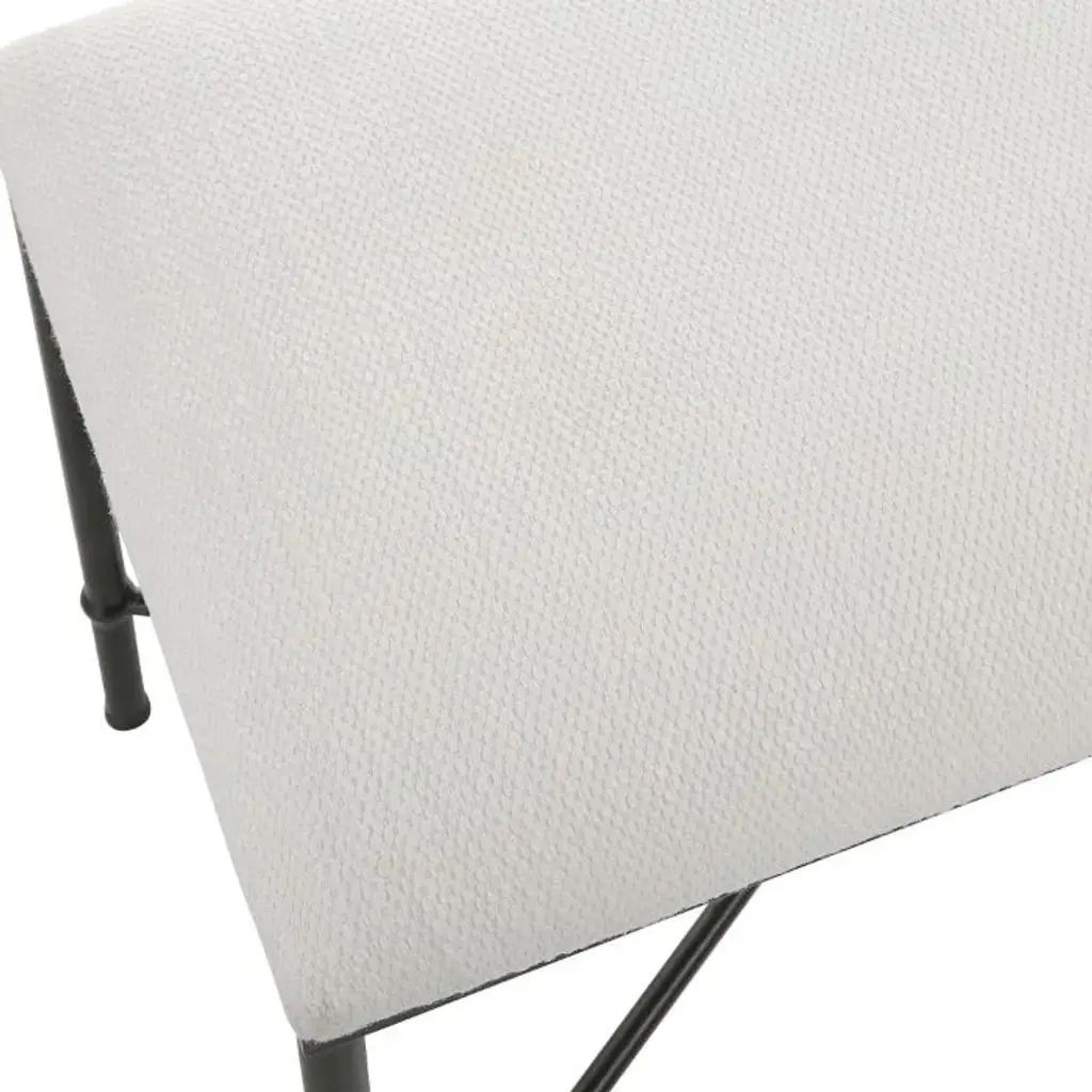 This eye-catching bench is sure to make a statement! Boasting a modern vibe with it's black + white design. The iron frame is finished in satin, upholstered in a crisp white textured fabric. Feature in a living or sitting room.