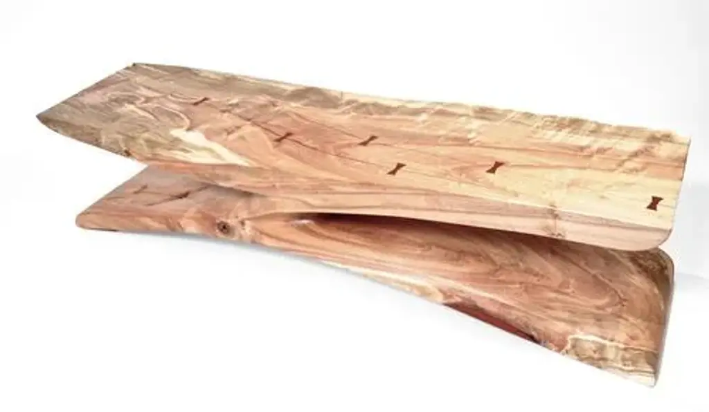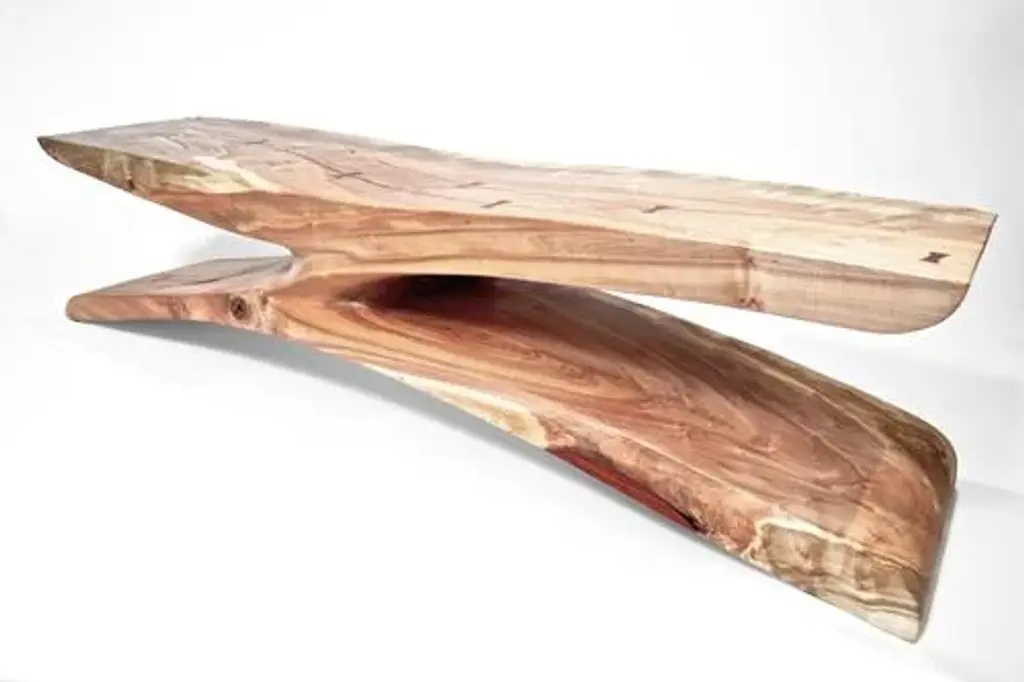 B1065 bench in pointed maple & padouk wood by jörg pietschmann dimensions: d 37 x w 154 x h 38 cm. Materials: maple and padouk. In pietschmann’s sculptures, trees that for centuries were part of a landscape and founded in primordial forces tell stories inscribed in the memory of their fibers. The forms jörg pietschmann pares from ancient trees are extensive and astonish with their physical presence, a combination of elegance and primeval nature. Pietschmann’s sculptures are monuments to the trees from which they derive. Being endowed with the ruggedness of primeval matter gives them a veritable vitality: figures that appear to have grown into their sculptural form of their own accord. But pietschmann’s tangibly present bodies have undergone a considerable degree of metamorphosis. In order to generate these unique tree specimens he examines the tree’s morphology and intrinsic inner map until the courses of its grain, of a curve, knots and cracks concur with his projections. The exploratory process is accompanied by constant modification, giving at the start of each new piece no more than an intimation of the figure that will later emerge. In their completion, pietschmann’s sculptures once more become universal form. Jörg pietschmann`s workshop is situated on the countryside close to hamburg. He works with indigenous timber as oak, lime tree, beech, poplar, olive tree and maple felled by the wind or human hand, together with tropical timber found on his travels. This piece is attributed to the mentioned designer/maker. It has no attribution mark and no official proof of authenticity, however it is well documented in design history. I take full responsibility for any authenticity issues arising from misattribution