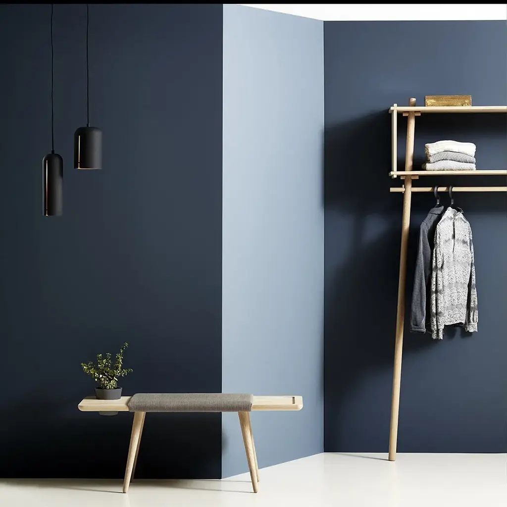 Baenk is a multifunctional bench made of clean minimalistic lines inspired by the Nordic traditions. The bench is made of solid oak with a focus on the unique veins that bring nature inside and give each unit a very special and distinctive look. By adding the bench a shelf and a seat, it can be used in multiple contexts. The circular shaped hole on the side can be used for an umbrella or plant. The shape of the bench is inspired by old cardboard embroidery thread bobbins. Based on this inspiration, the middle piece has been upholstered to provide increased comfort. The fabric is carefully selected to complement the structure and shades of the wood.Baenk is available in soap treated solid oak and smoked oak.
