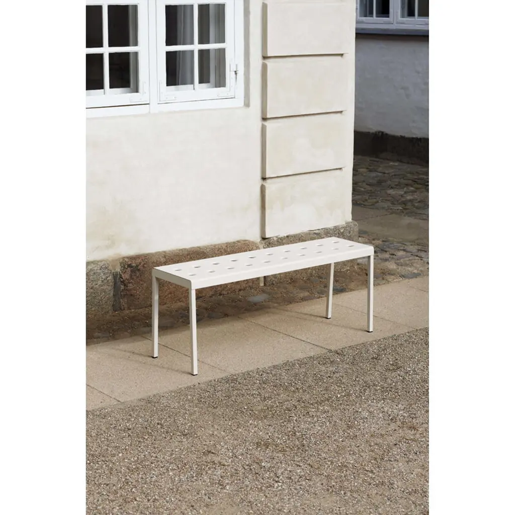 HAY’s Balcony bench is part of a clever collection of outdoor furniture designed by the Bouroullec brothers. Made of thin steel sheet, the elegant Balcony benches are incomparably light and easy to move – a perfect addition to the balcony, the garden or a patio. Featuring a weather-resistant coating the Balcony collection is as carefree as it looks. The round holes pressed through the steel plate provide multiple functions: they add character and softness to the geometrical design and allow rainwater to drain off the bench's surface, while also strengthening the structure of the furniture. Add some extra comfort and complete the look with Balcony cushions, sold separately.