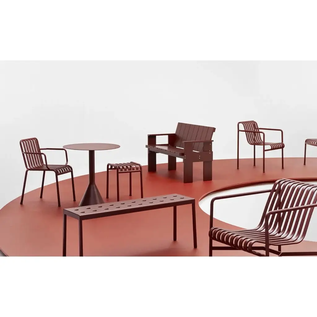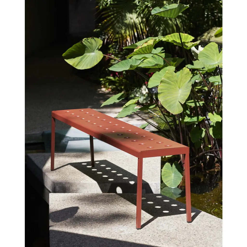 HAY’s Balcony bench is part of a clever collection of outdoor furniture designed by the Bouroullec brothers. Made of thin steel sheet, the elegant Balcony benches are incomparably light and easy to move – a perfect addition to the balcony, the garden or a patio. Featuring a weather-resistant coating the Balcony collection is as carefree as it looks. The round holes pressed through the steel plate provide multiple functions: they add character and softness to the geometrical design and allow rainwater to drain off the bench's surface, while also strengthening the structure of the furniture. Add some extra comfort and complete the look with Balcony cushions, sold separately.