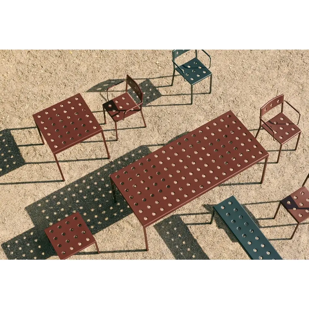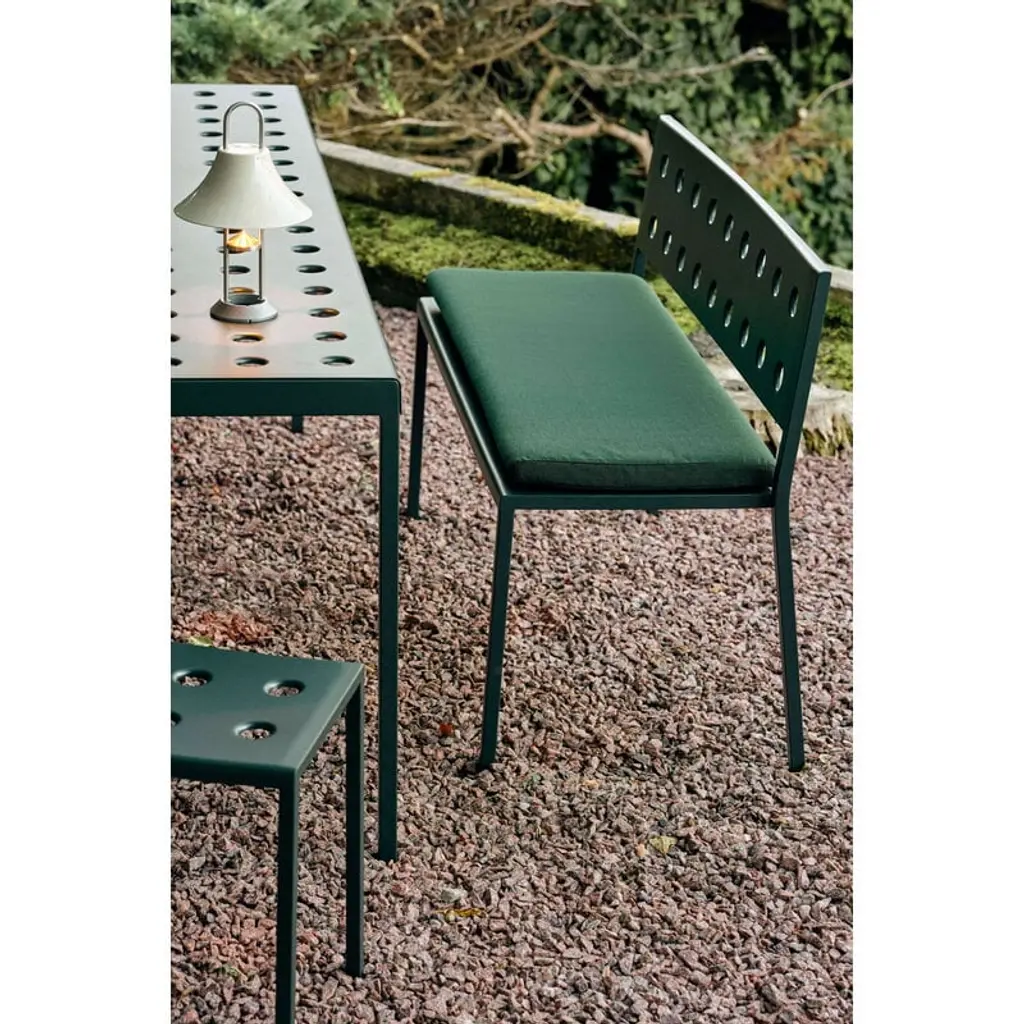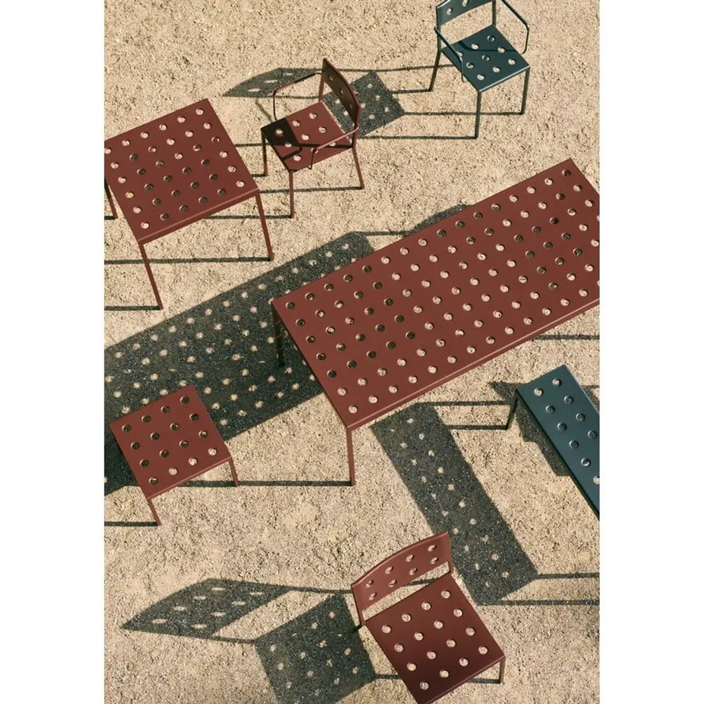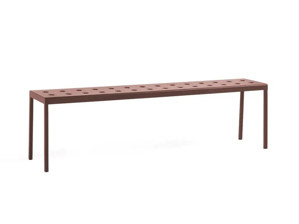 HAY’s Balcony bench is part of a clever collection of outdoor furniture designed by the Bouroullec brothers. Made of thin steel sheet, the elegant Balcony benches are incomparably light and easy to move – a perfect addition to the balcony, the garden or a patio. Featuring a weather-resistant coating the Balcony collection is as carefree as it looks. The round holes pressed through the steel plate provide multiple functions: they add character and softness to the geometrical design and allow rainwater to drain off the bench's surface, while also strengthening the structure of the furniture. Add some extra comfort and complete the look with Balcony cushions, sold separately.