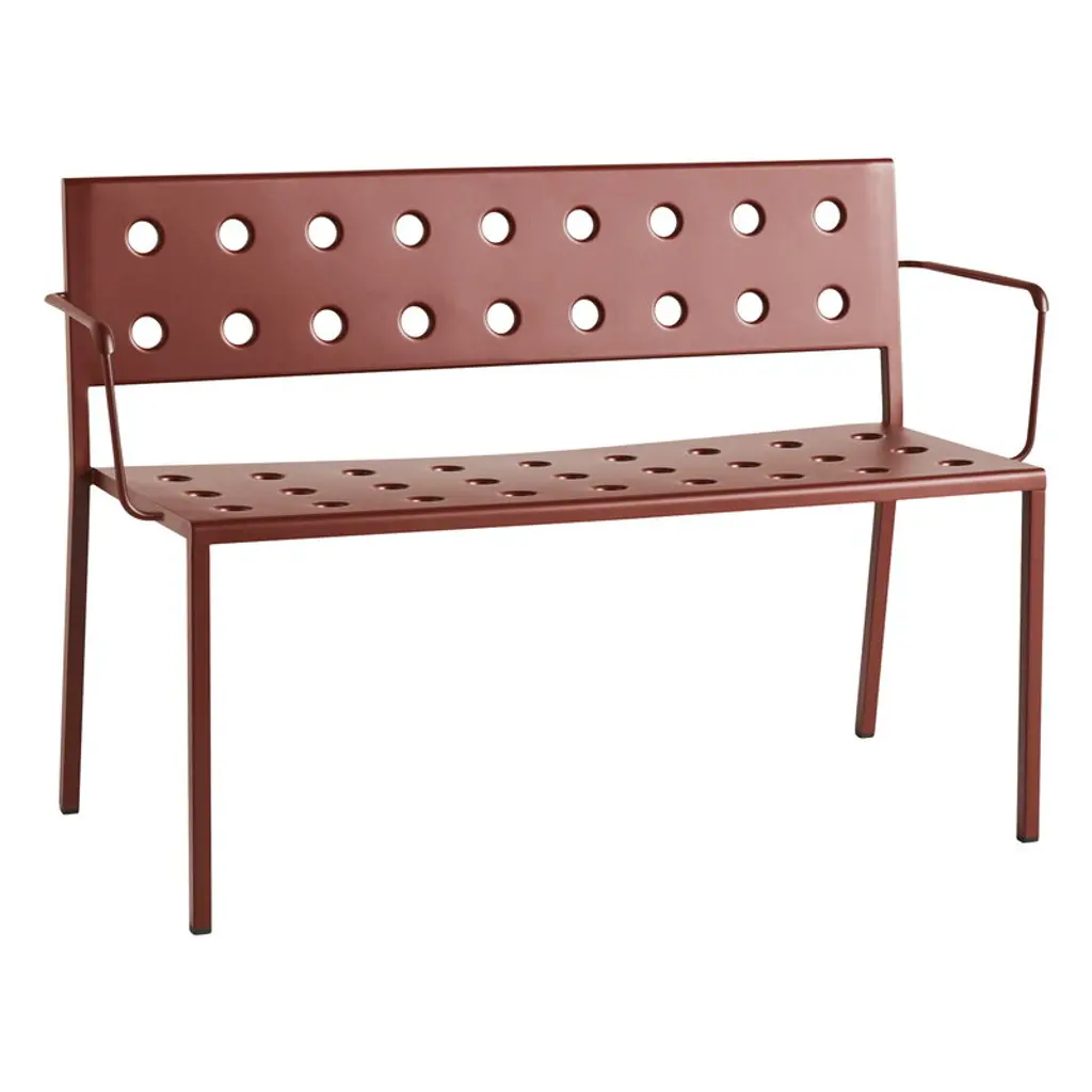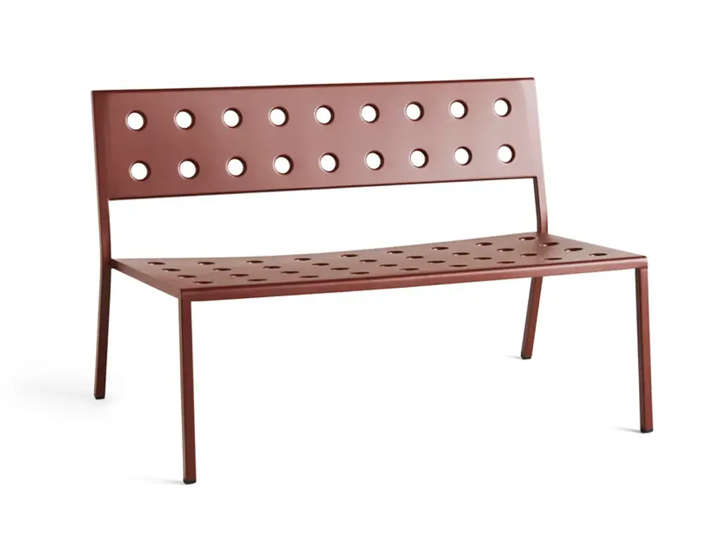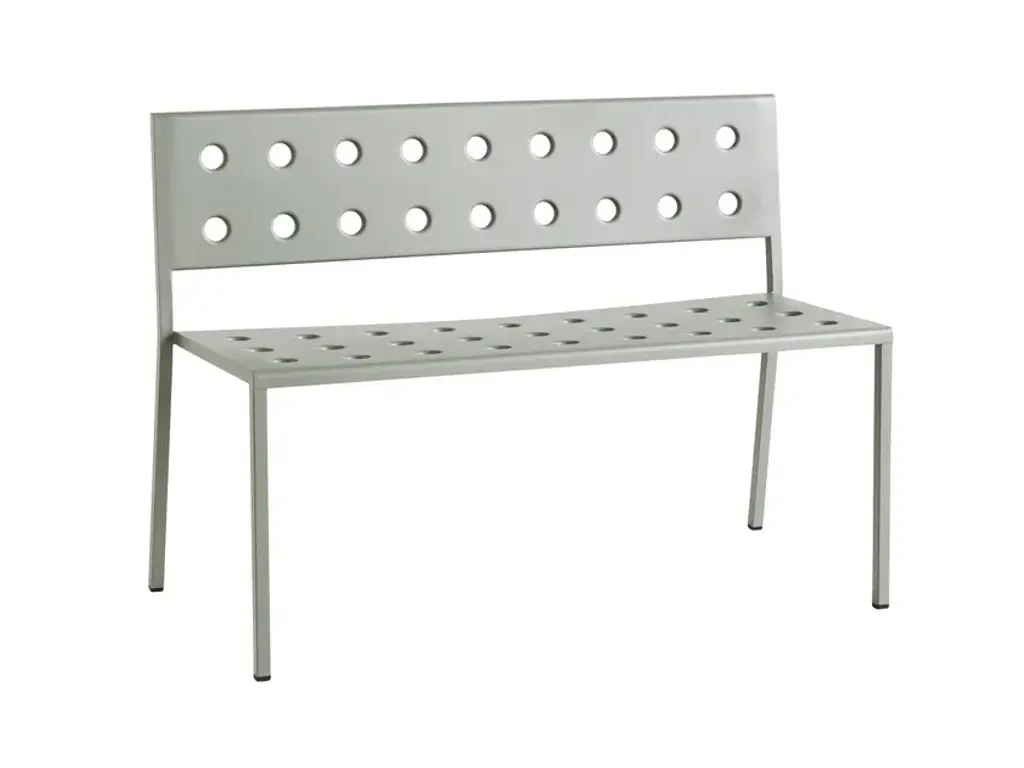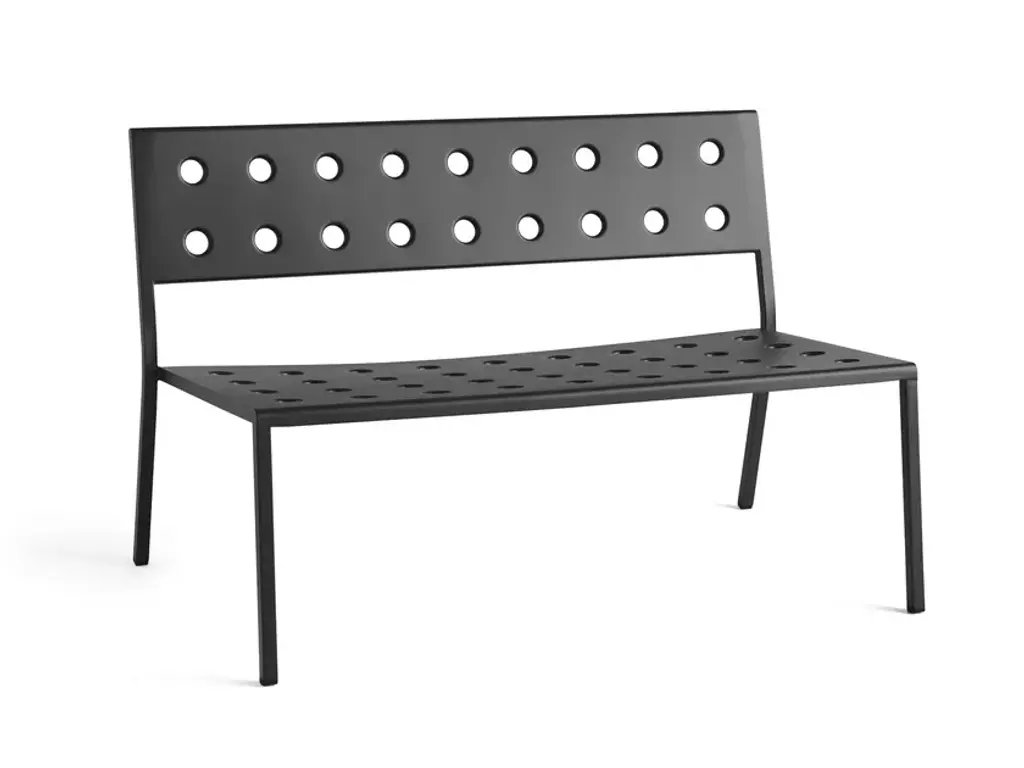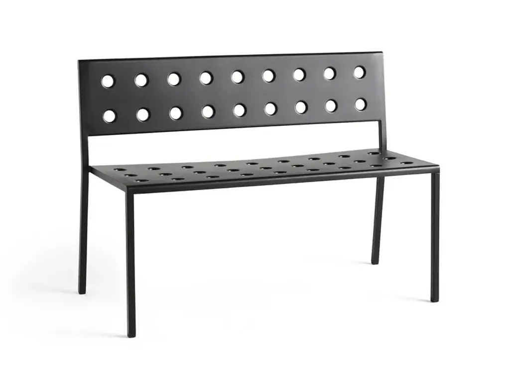 Balcony, designed by Ronan & Erwan Bouroullec for HAY, is a bench with backrest for the outside, with simple and square lines, characterized by holeson the surfaces that not only define the design but also reinforce the seat and back. The stackable design of the chair makes it suitable for all types of spaces, from small balconies and terraces to gardens and other larger outdoor areas.Made of powder coated steel with an outdoor primer for optimal strength and durability, Balcony is available in a number of different color options.Available in 5 finishes:- Anthracite power coated steel (RAL 9011)- Iron red powder coated steel (RAL 8015)- Desert green powder coated steel (RAL 140 50 05)- Dark forest powder coated steel (RAL 180 20 05)- Chalk beige powder coated steel (RAL 075 80 10)