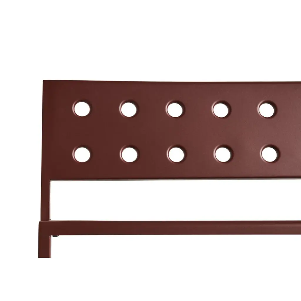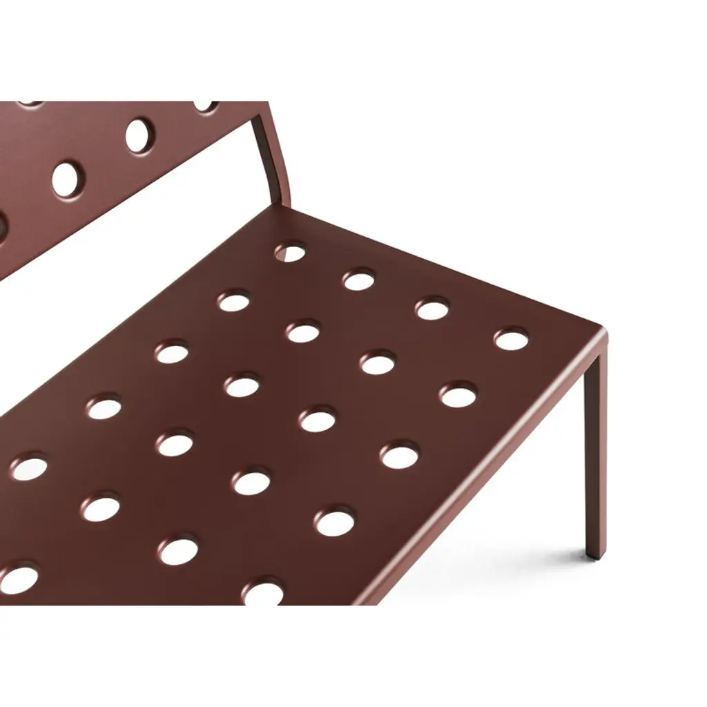 HAY's Balcony Lounge bench is part of a clever collection of outdoor furniture designed by the Bouroullec brothers. Made of thin steel sheet, the elegant Balcony outdoor benches and seats are incomparably light and easy to move – a perfect addition to the garden, patio, terrace or balcony. The round holes pressed through the steel plate provide multiple functions: they add character and softness to the geometrical design and allow rainwater to drain off the bench's surface, while also strengthening the structure of the furniture. Featuring a weather-resistant coating the Balcony collection is as carefree as it looks. Try combining a low Balcony Lounge bench with a Balcony table of the same color – or choose a table in a completely different hue to create some funky color combinations! If you're looking for extra comfort, there are Balcony seat cushions sold separately, also available in many different pleasing shades.