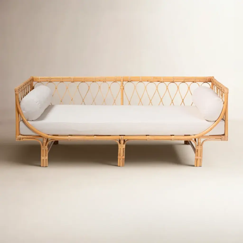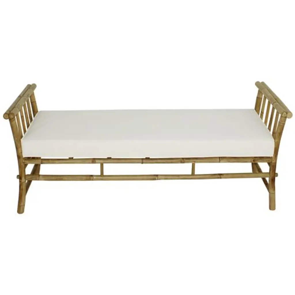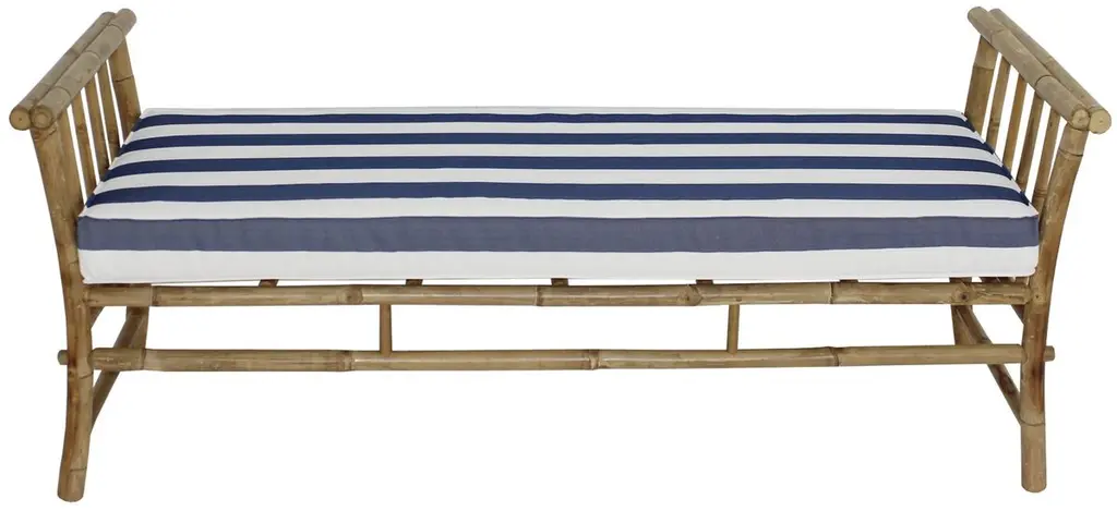 Artisan-crafted of hearty, natural bamboo with splayed framework and a warm finish, this five-foot bench embodies a luxe, tropical vibe. Weatherproof upholstery amply padded with foam welcomes guests with long-lasting comfort and support. Because each item is made using natural materials, minor variations should be expected.