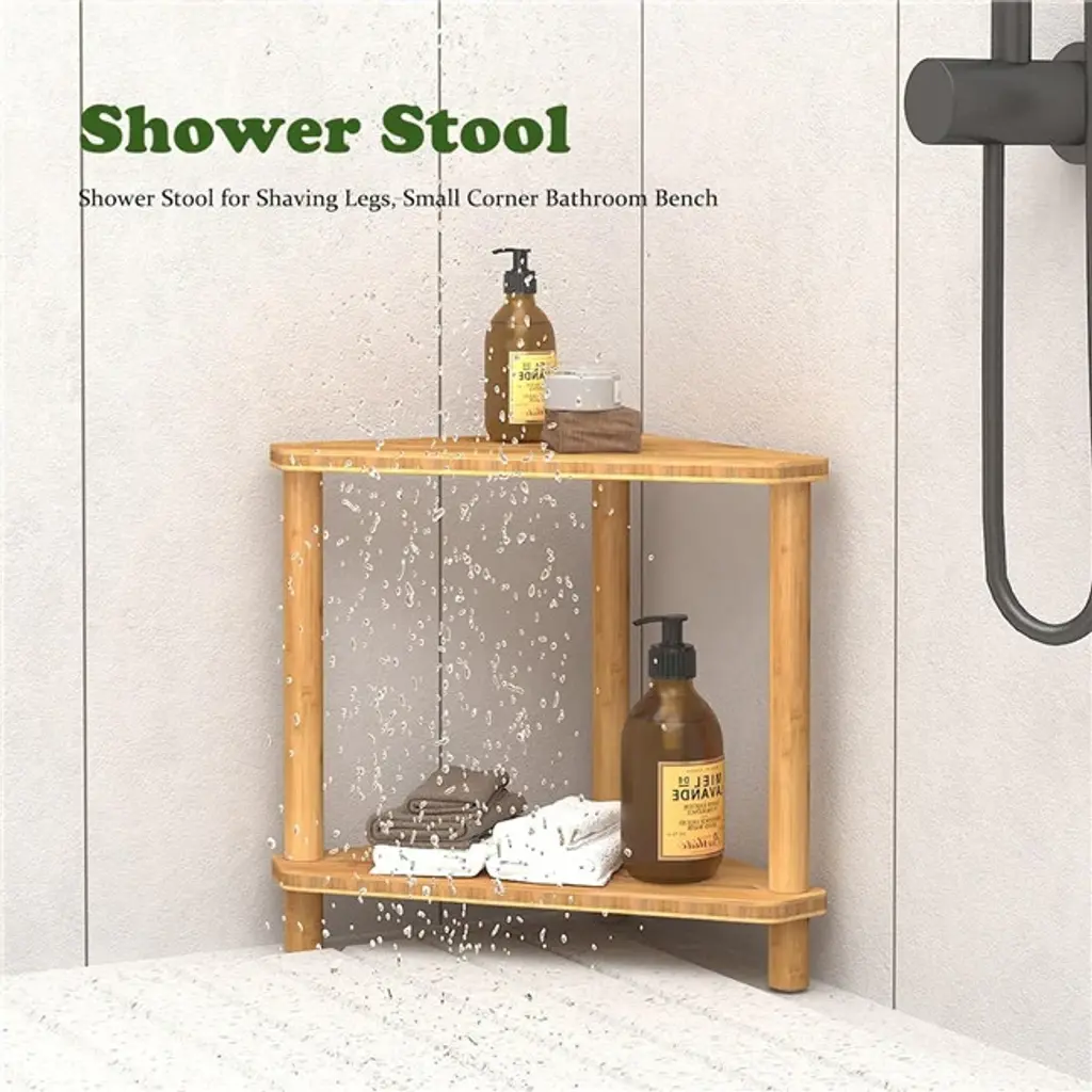 EASY TO ASSEMBLE: This shower corner stool comes with all the tools and instructions needed for assembly, with the advantages of novel structure, sturdy, stable, easy to assemble, easy to disassemble, the assembly time is less than 5 minutes. MULTIFUNCTIONAL:Our shower footstool is made of natural bamboo, well made to prevent scratches, overall size: 17.16 inches L x 12.4 inches W x 15 inches H. It can be used as a shower bench for shaving feet, and can also be placed in the bathroom, living room, bedroom, spa, sauna, balcony, patio, and any other place you need. WATERPROOF AND NON-SLIP:Our bamboo shower bench is made with three waterproof and mold resistant processes, which greatly improves the durability of the product, meanwhile, the bottom of the shower bench is equipped with 3 non-slip rubber feet, which prevents the shower bench from sliding and protects the tiles and floors. DOUBLE LAYER DESIGN:Our shower footrests are double-layered to allow you to enjoy versatility. The top is a comfortable footrest for shaving and foot care, while the bottom is a spacious storage compartment for bath products or shampoo etc.