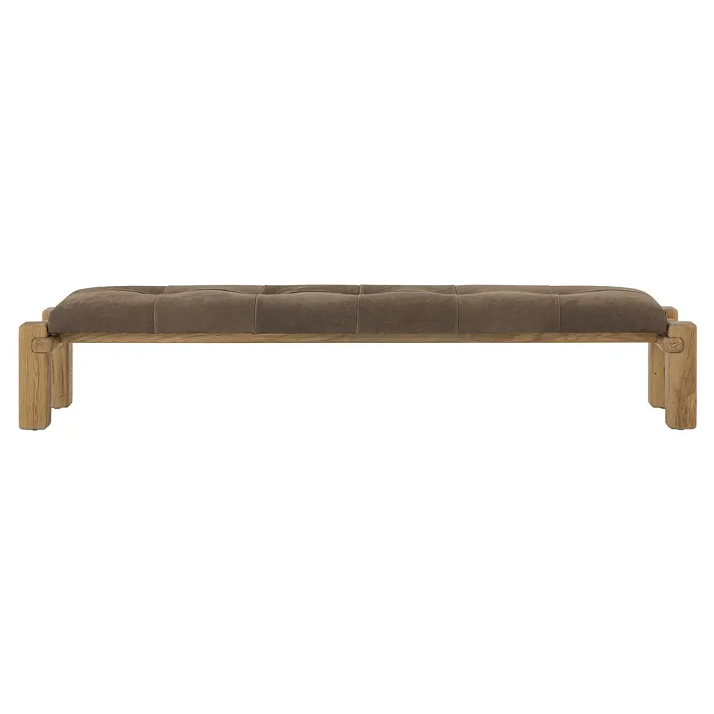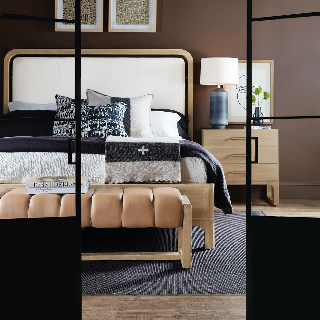 Introduce luxury into your bedroom with the Banyon Bay Bench from Hooker. Made from white oak solids and veneers, and finished with top-grain leather, this bench offers a modern yet elegant design. The multi-step Desert Oak finish adds a pleasant texture, while the channeled leather seat provides both comfort and style. A versatile piece for any space. Highlights
