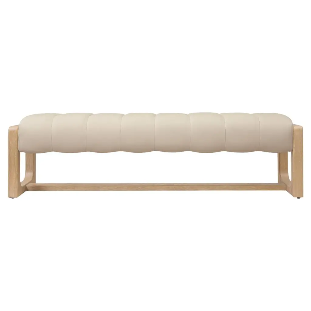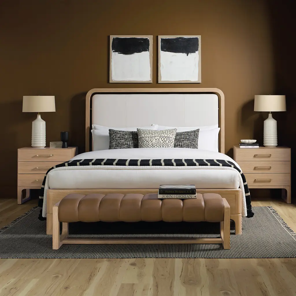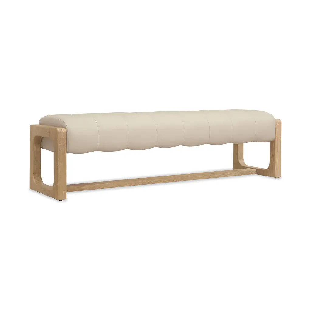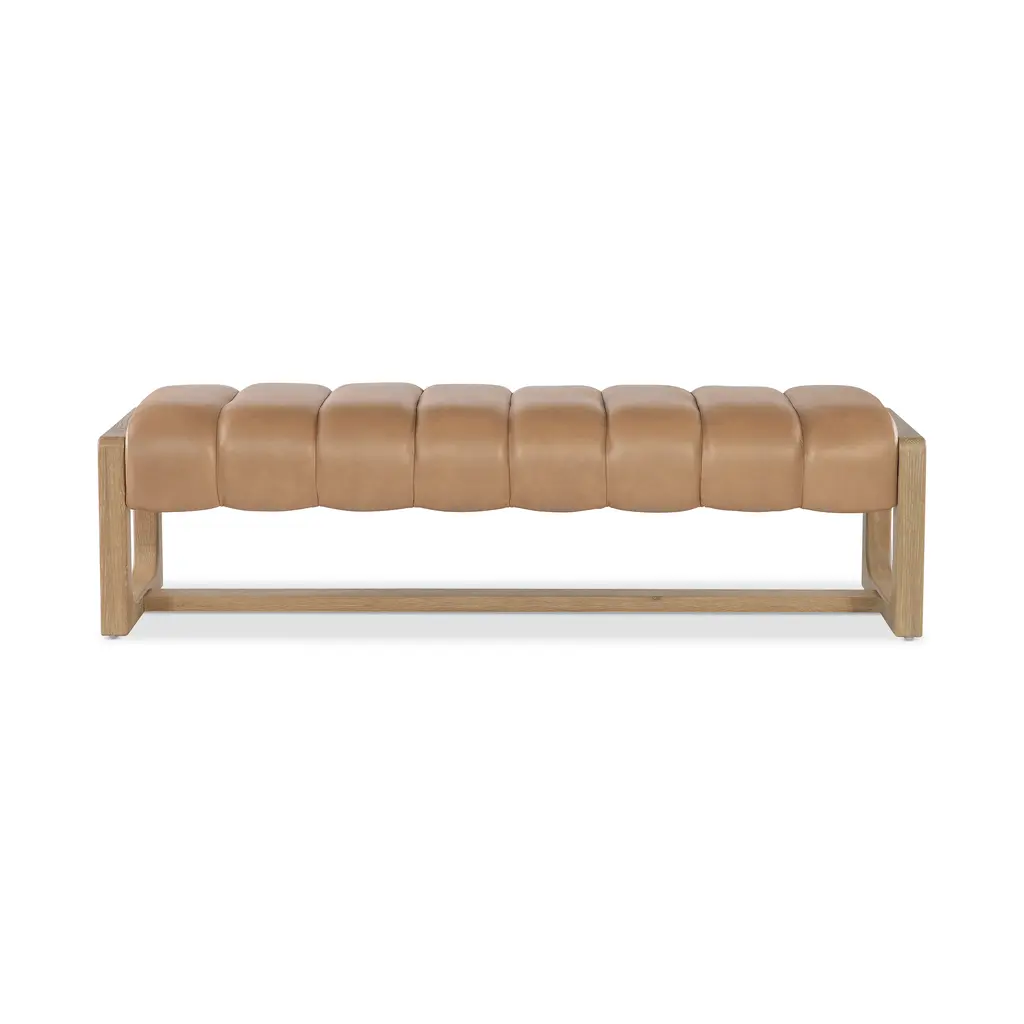 Introduce luxury into your bedroom with the Banyon Bay Bench from Hooker. Made from white oak solids and veneers, and finished with top-grain leather, this bench offers a modern yet elegant design. The multi-step Desert Oak finish adds a pleasant texture, while the channeled leather seat provides both comfort and style. A versatile piece for any space. Highlights