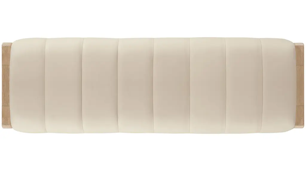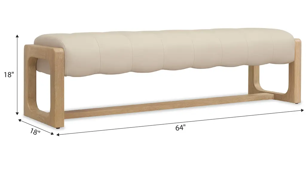 The Banyon Bay Bench combines natural materials with a contemporary design. Crafted from white oak solids, oak veneers, and finished top-grain leather in a sunbleached tone, this bench adds an element of modern sophistication to your bedroom. The multi-step Desert Oak finish, with wire-brushing and cerusing, enhances its texture. The bench features a long rectangle shape with open ends and a channeled leather seat, providing both comfort and style. It's a versatile piece that can be placed at the foot of the bed or used as extra seating in a bedroom or hallway.