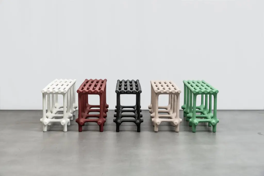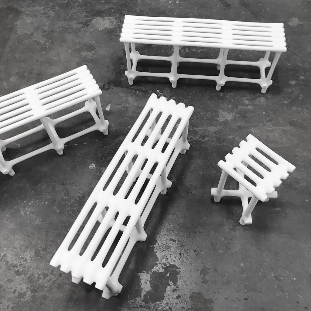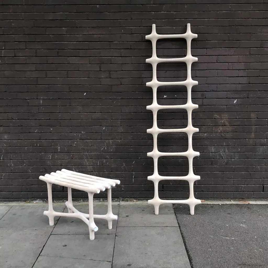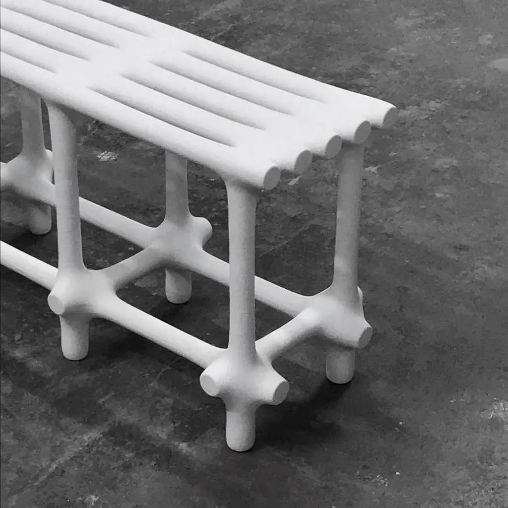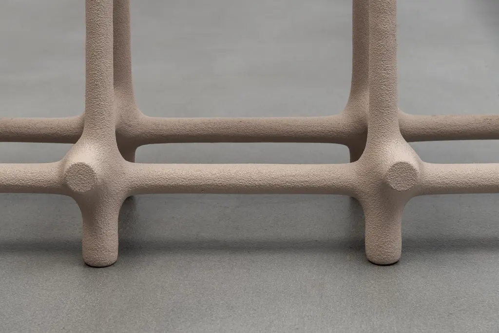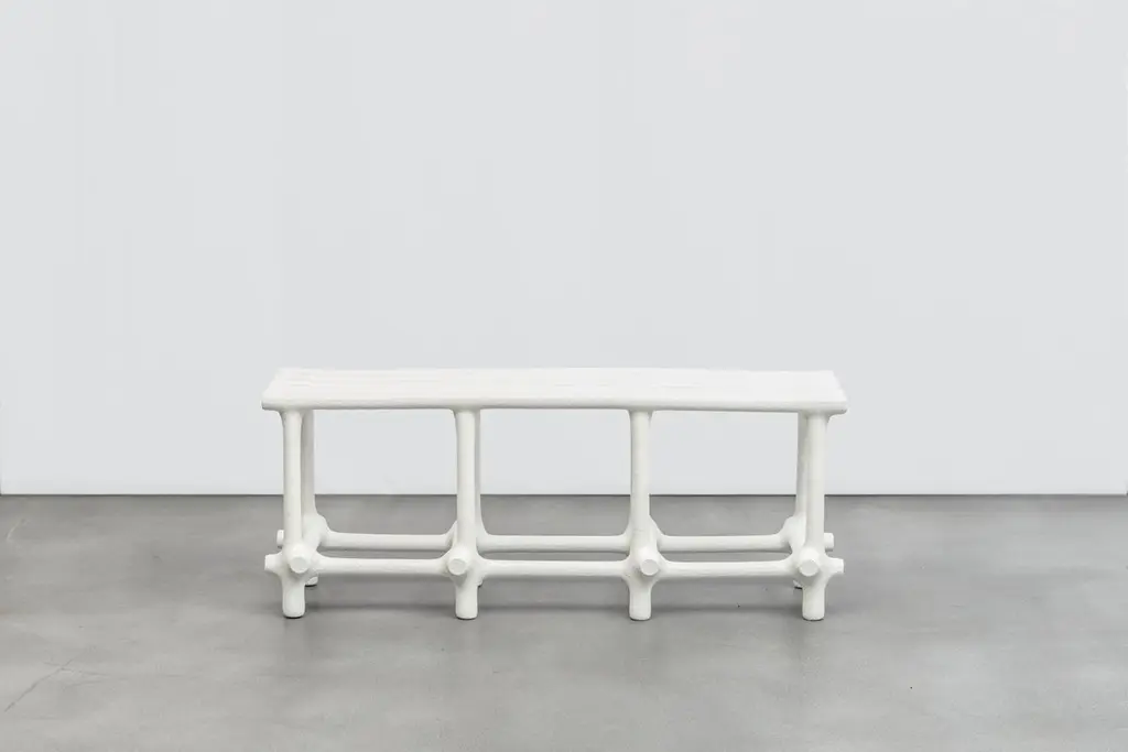 Basic Limited Edition Sculptural Nylon and Sand Bench by Hot Wire ExtensionsLimited EditionMaterials: Waste SLS 3D nylon powder, sand from sustainable sourcesDimensions: H 48 x W 120 x D 34 cm Colours: black, white, cream, terracotta, mintHot wire extensions is a young sustainable design brand, presenting a bold innovative manufacturing process.Exploration is central to our philosophy and the Hot Wire Extensions process is conceivedwith this in mind. Using waste SLS 3D nylon powder, a material that is currently not recycled, and inspired by the way a vine grows around a tree, we reuse the material to create organic bone-like structures builtaround a wire.We design and develop a diverse range of products, furniture and installations as well as bespoke commissions all characterised by our dedication to the mindful exploration ofnew material landscapes.