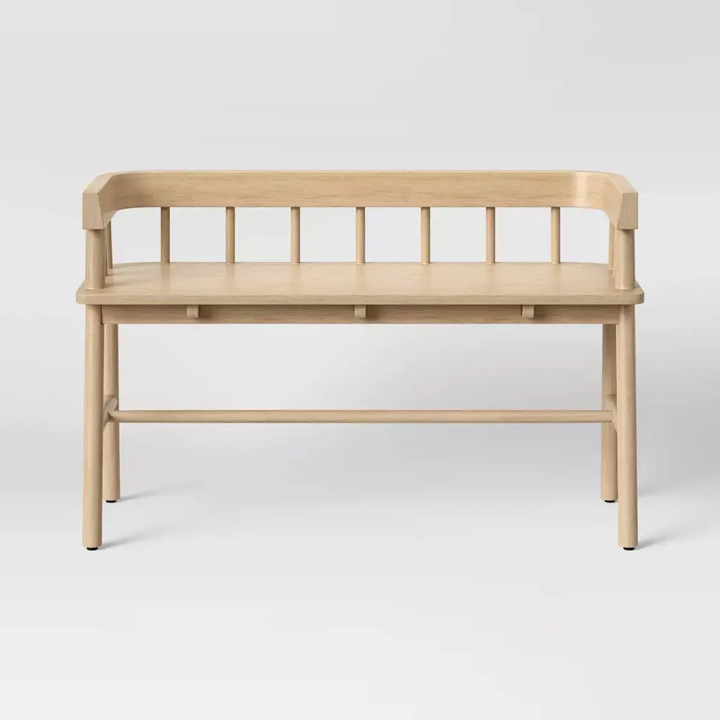 Refresh your occasional seating in simple style with this Bayboro Wood Spindle Bench from Threshold™. Designed with wooden frame in a light natural shade, this bench has a spindle back for an airy look that's both simple and timeless. You can use this wood bench in your entryway for an easy spot to slip shoes and coats on and off, or place it in the hall for a subtle accent.