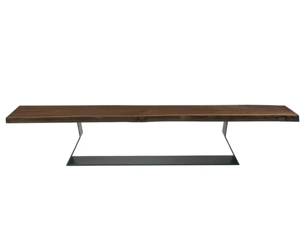 BEDROCK PLANK BENCH is a bench with a solid wood seat, made from a single slab with natural edges, combined with a sheet-iron base featuring geometric lines.