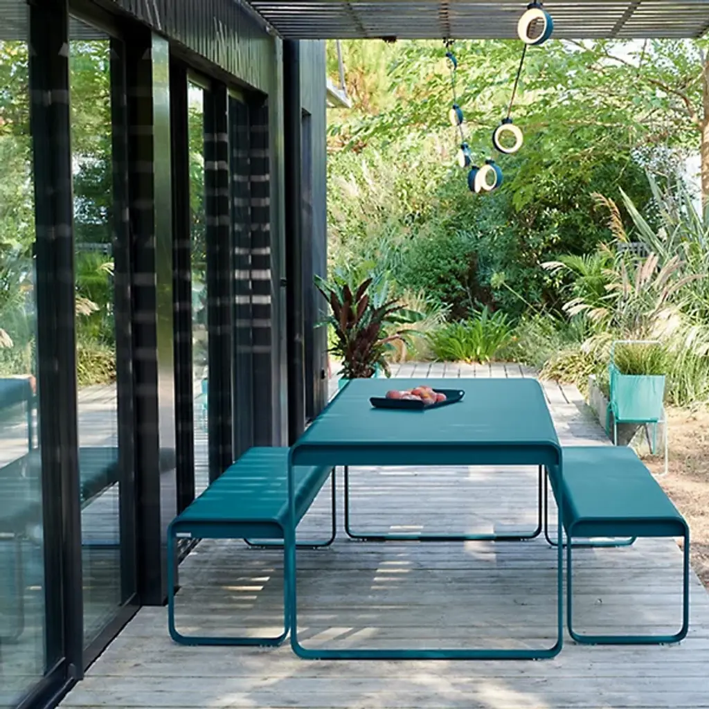 With a clean form and rounded edges designed to complement the Bellevie Table, the Fermob Bellevie Bench will provide stylishly durable seating anywhere outdoors. It has an aluminum base and steel seat, both components covered in one of a multitude of available powder coated colors. At table or poolside, this bench comfortably seats 3-4 people.