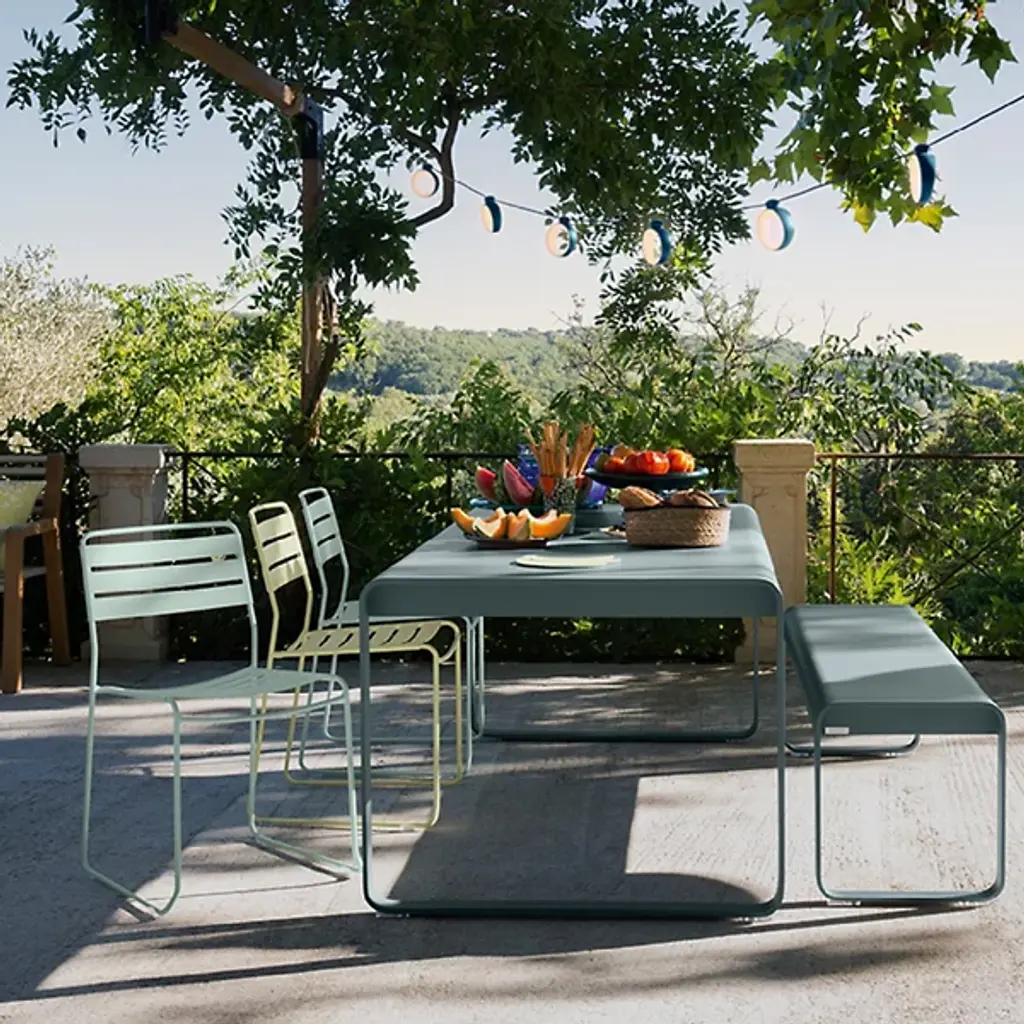 With a clean form and rounded edges designed to complement the Bellevie Table, the Fermob Bellevie Bench will provide stylishly durable seating anywhere outdoors. It has an aluminum base and steel seat, both components covered in one of a multitude of available powder coated colors. At table or poolside, this bench comfortably seats 3-4 people.