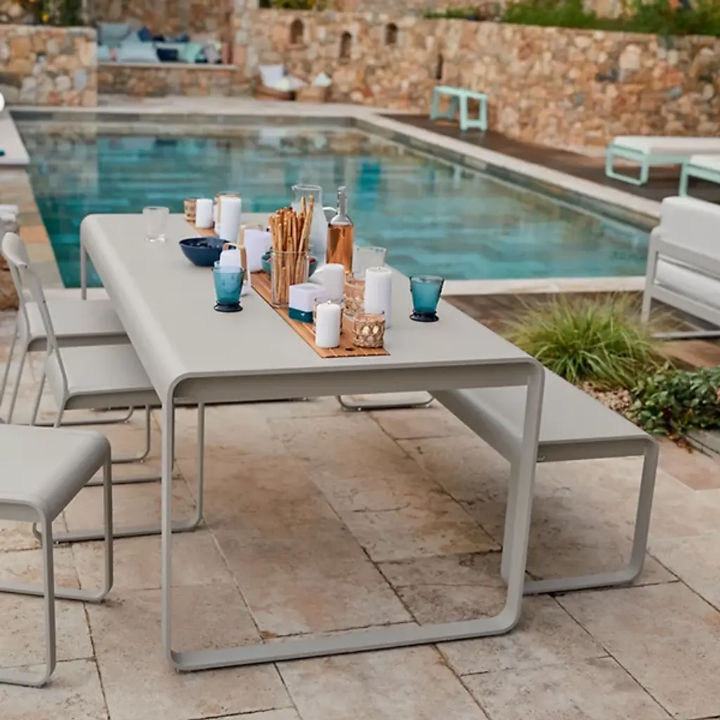Bench seating that’s ready for action…lots of it. The Bellevie Premium Bench by Fermob is designed to look good and function well for a long time, even when it’s used a lot. It is reinforced with stiffened crosspieces under the steel sheet seat and drilled holes in the aluminum base should you need to mount it to the ground permanently. A polyester powder coat finish enhances the bench’s smooth, modern lines while also protecting it from damaging UV rays. Designed by Pagnon & Pelhaître Design.