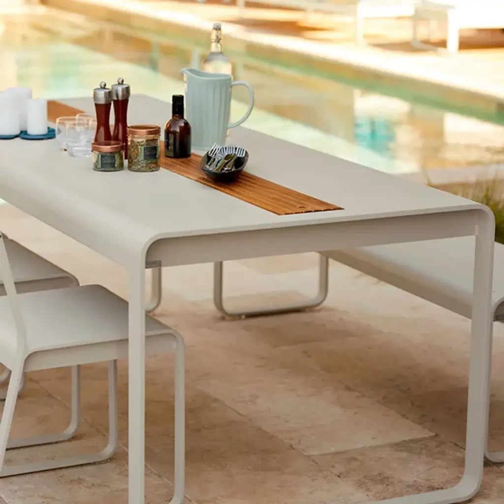 Bench seating that’s ready for action…lots of it. The Bellevie Premium Bench by Fermob is designed to look good and function well for a long time, even when it’s used a lot. It is reinforced with stiffened crosspieces under the steel sheet seat and drilled holes in the aluminum base should you need to mount it to the ground permanently. A polyester powder coat finish enhances the bench’s smooth, modern lines while also protecting it from damaging UV rays. Designed by Pagnon & Pelhaître Design.
