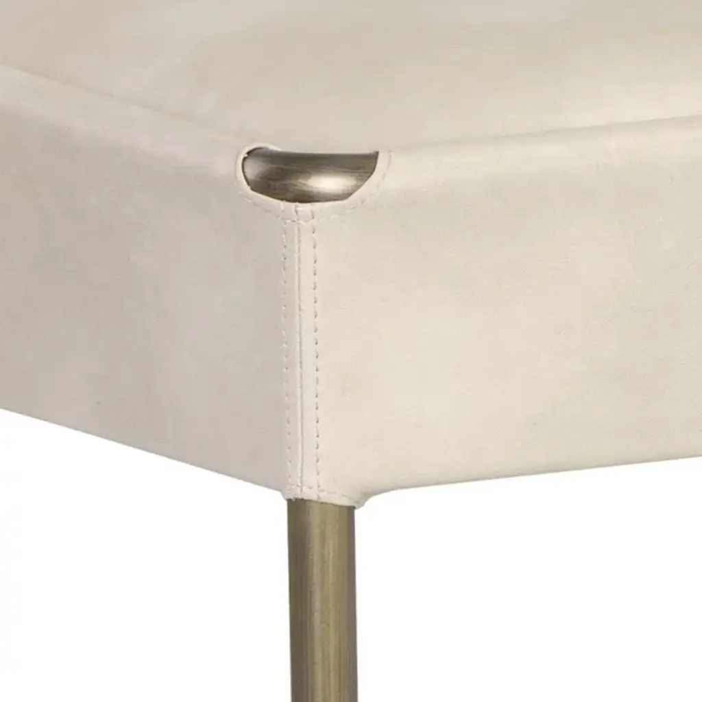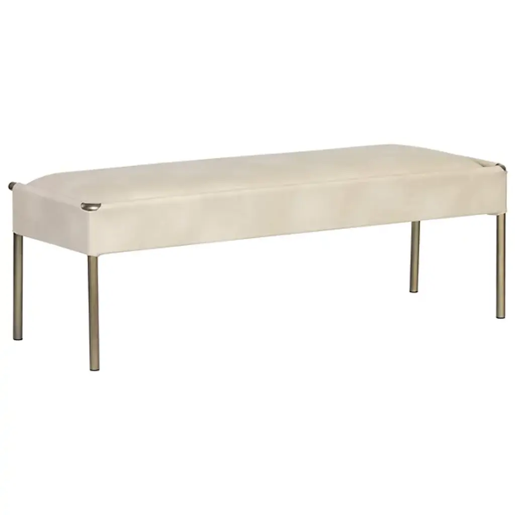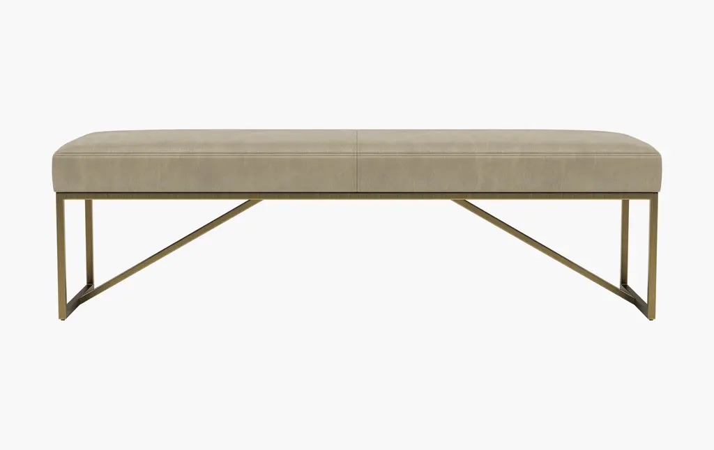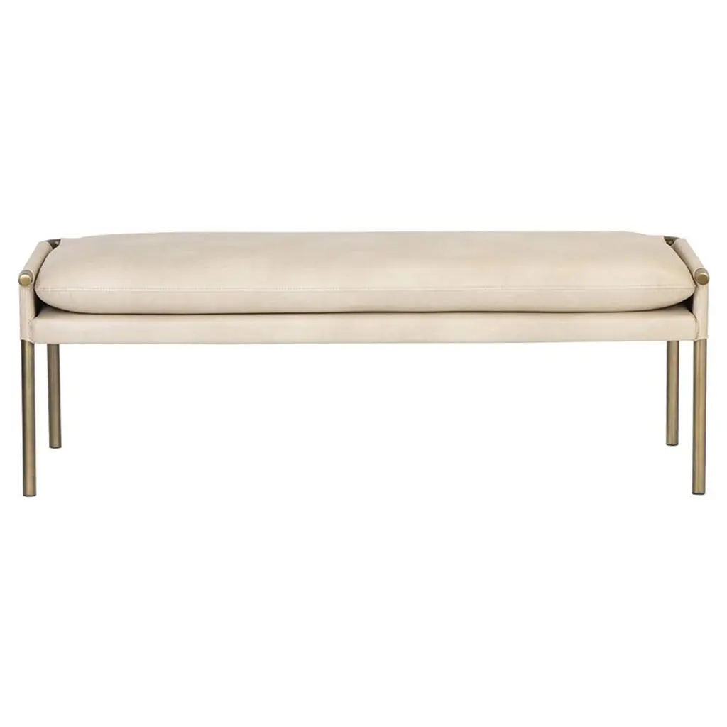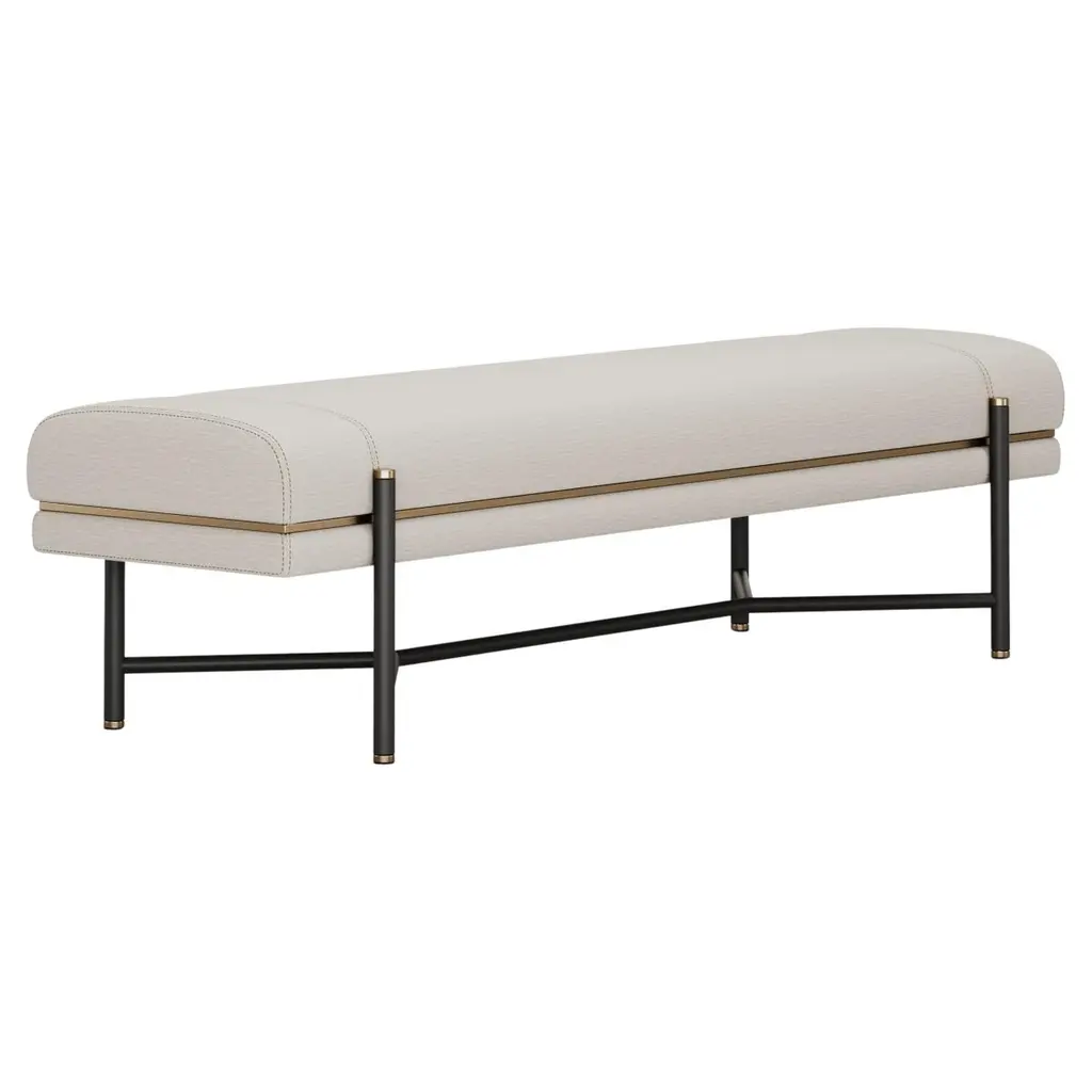 Enhance living spaces with the Bellevue Bench from Sunpan, an elegant fusion of soft textures and contrasting materials. The sophisticated seat fabric contrasts with an antique brass-textured frame, offering style and durability. The bench uses its bracket-style metal structure to support and contrast with the fabric upholstery, adding a layer of inspired comfort. Each piece showcases unique characteristics, with subtle variations in color and textures, ensuring no two are alike.