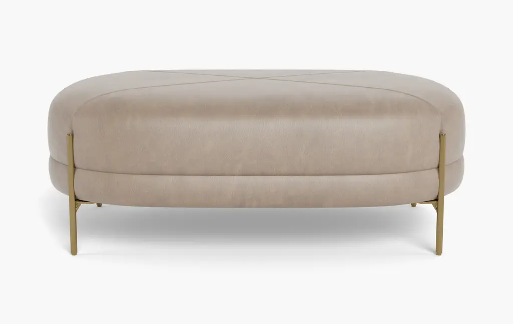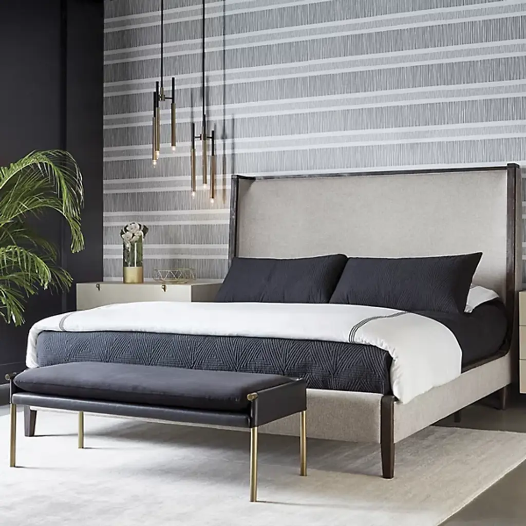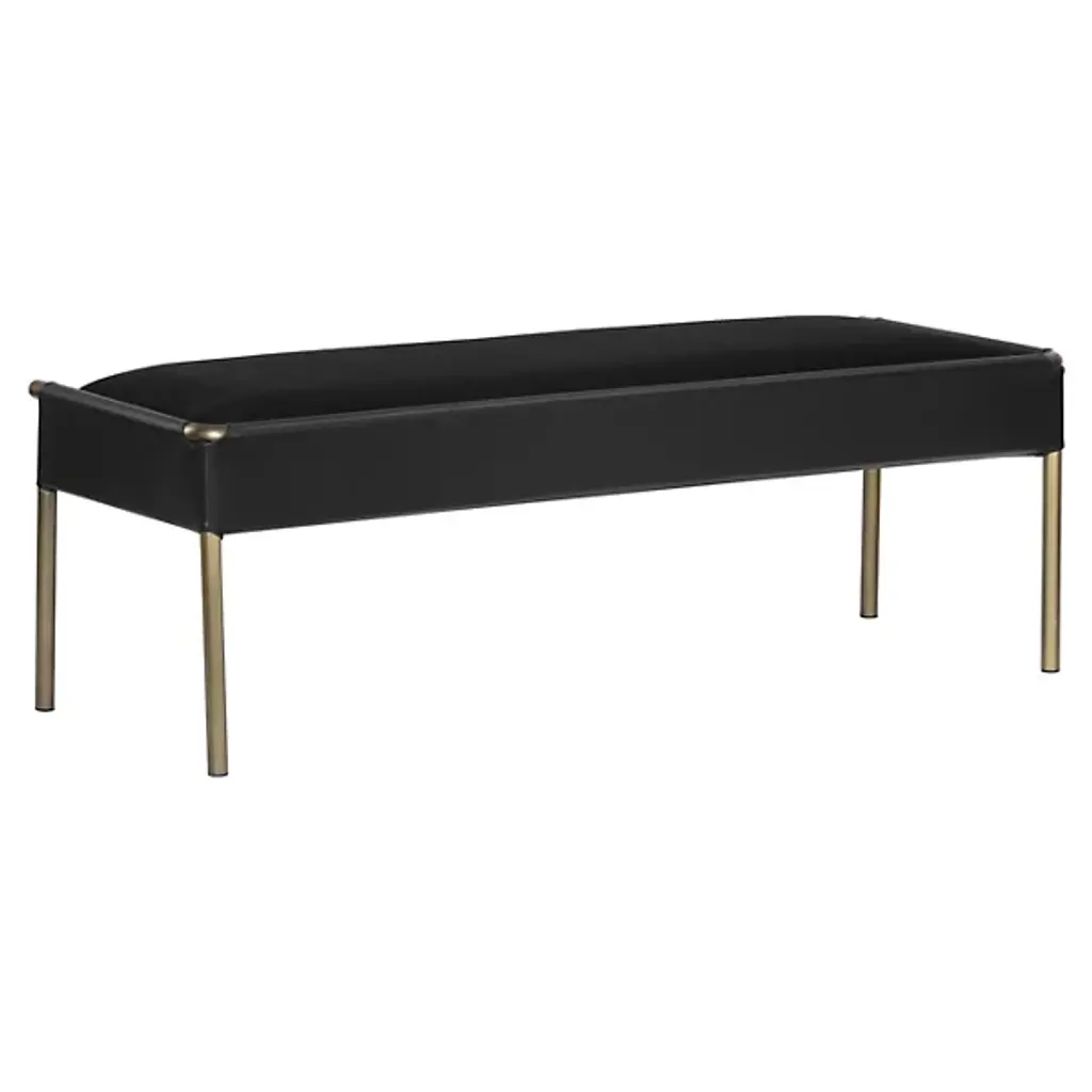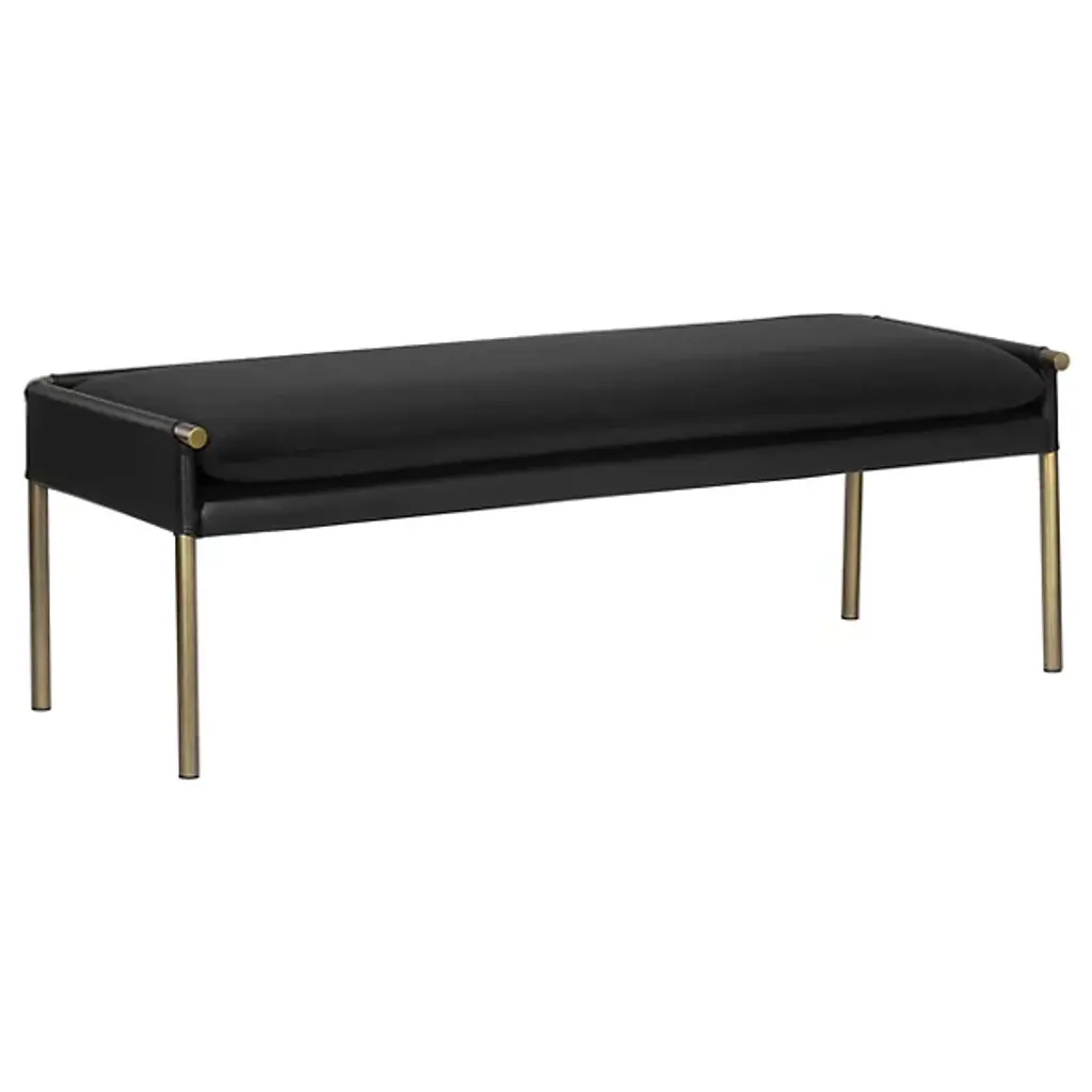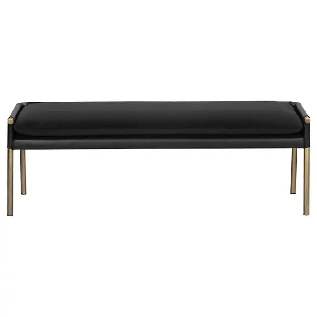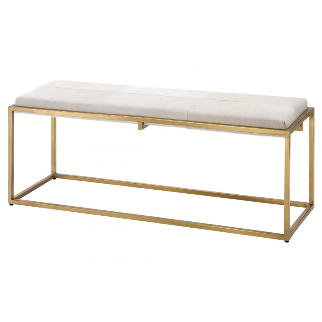 Enhance living spaces with the Bellevue Bench from Sunpan, an elegant fusion of soft textures and contrasting materials. The sophisticated seat fabric contrasts with an antique brass-textured frame, offering style and durability. The bench uses its bracket-style metal structure to support and contrast with the fabric upholstery, adding a layer of inspired comfort. Each piece showcases unique characteristics, with subtle variations in color and textures, ensuring no two are alike.