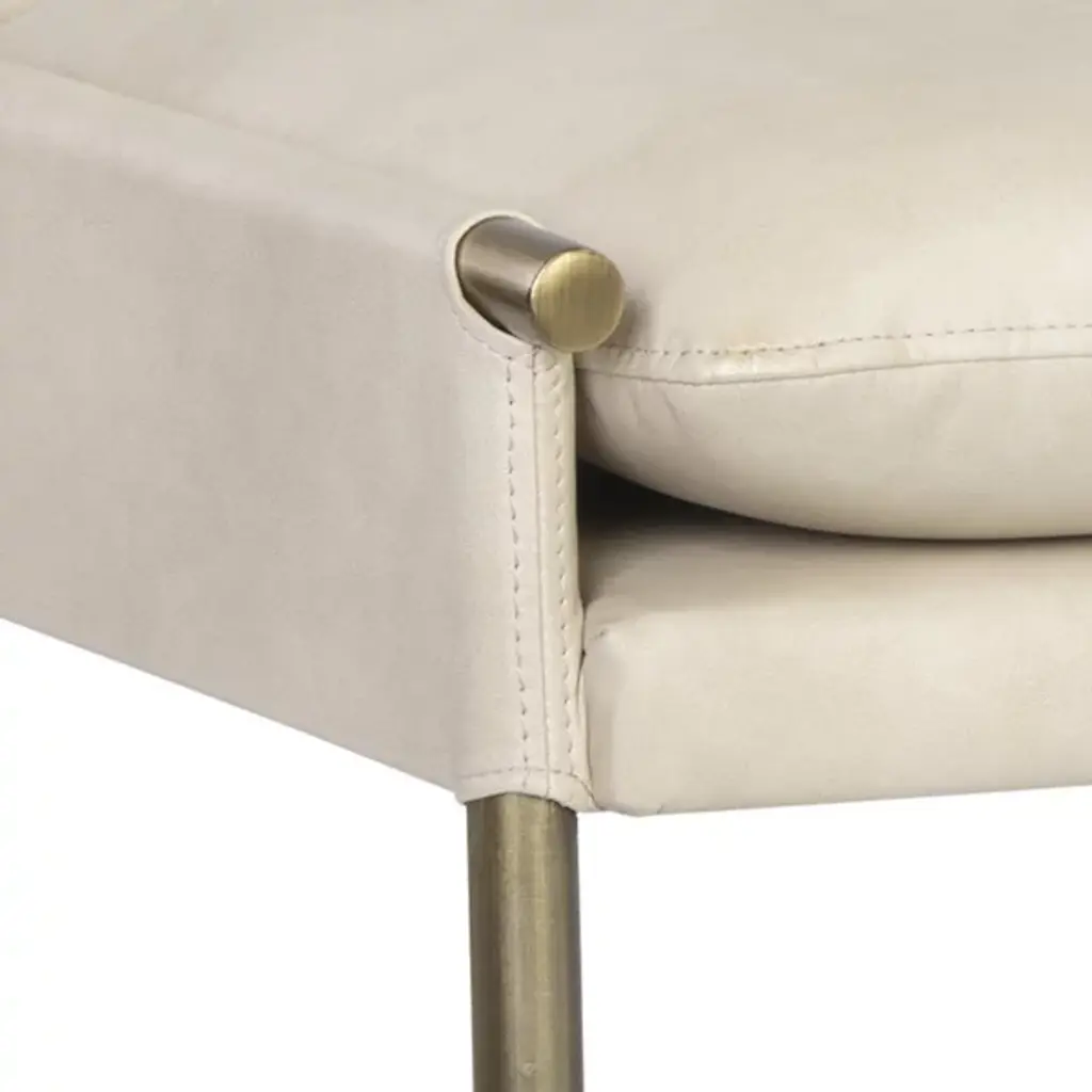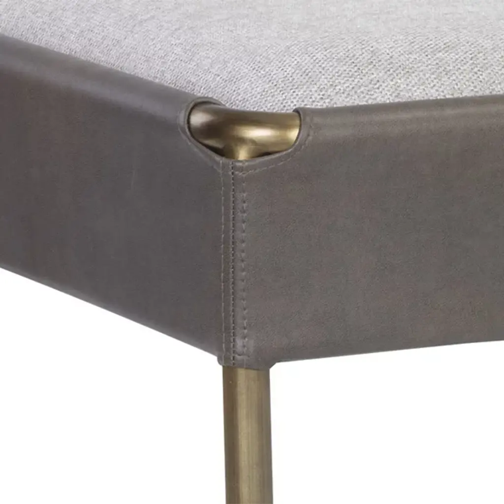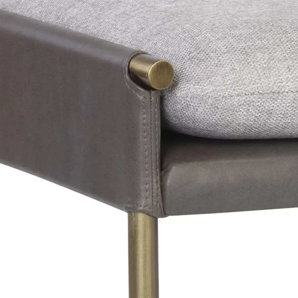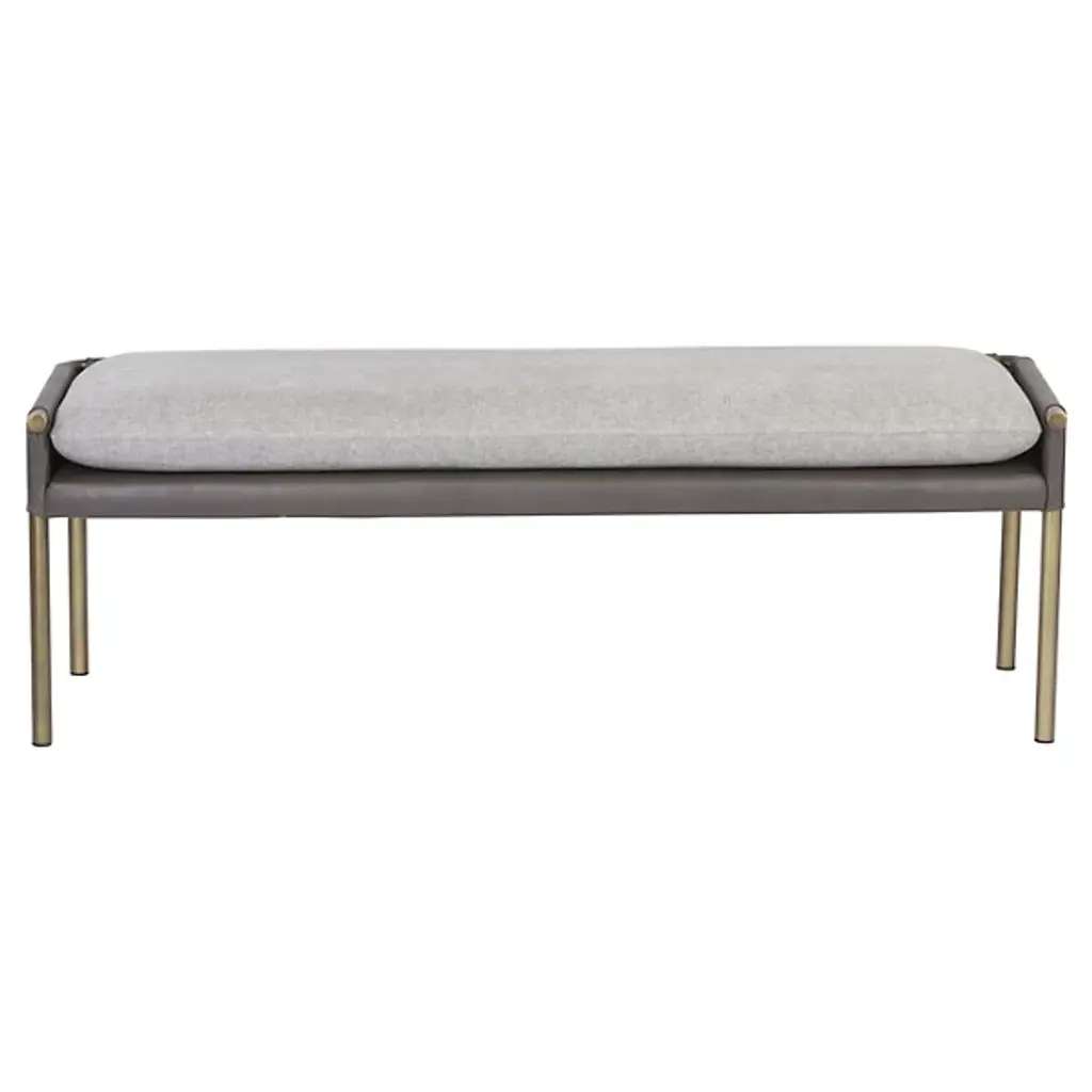 Enhance living spaces with the Bellevue Bench from Sunpan, an elegant fusion of soft textures and contrasting materials. The sophisticated seat fabric contrasts with an antique brass-textured frame, offering style and durability. The bench uses its bracket-style metal structure to support and contrast with the fabric upholstery, adding a layer of inspired comfort. Each piece showcases unique characteristics, with subtle variations in color and textures, ensuring no two are alike.