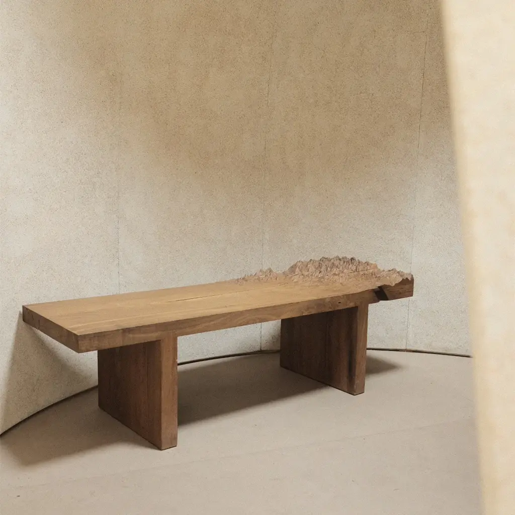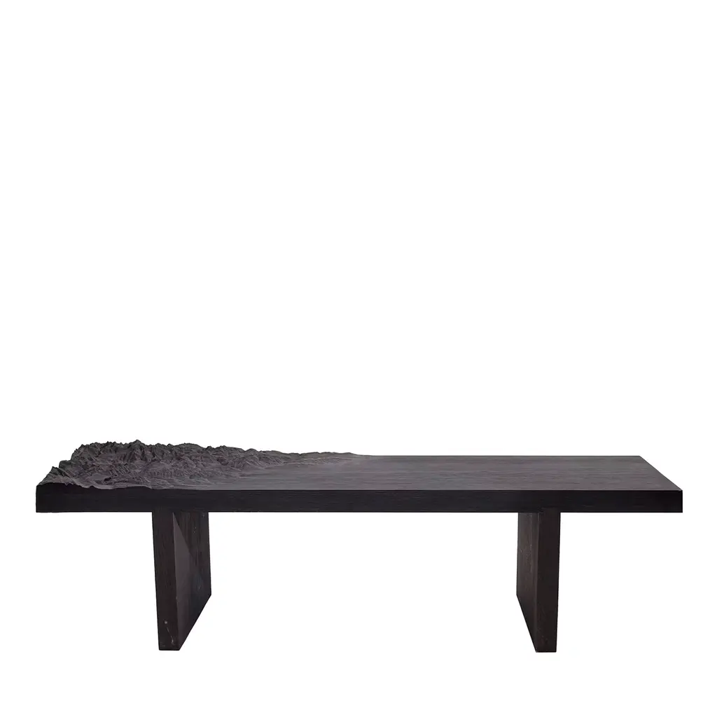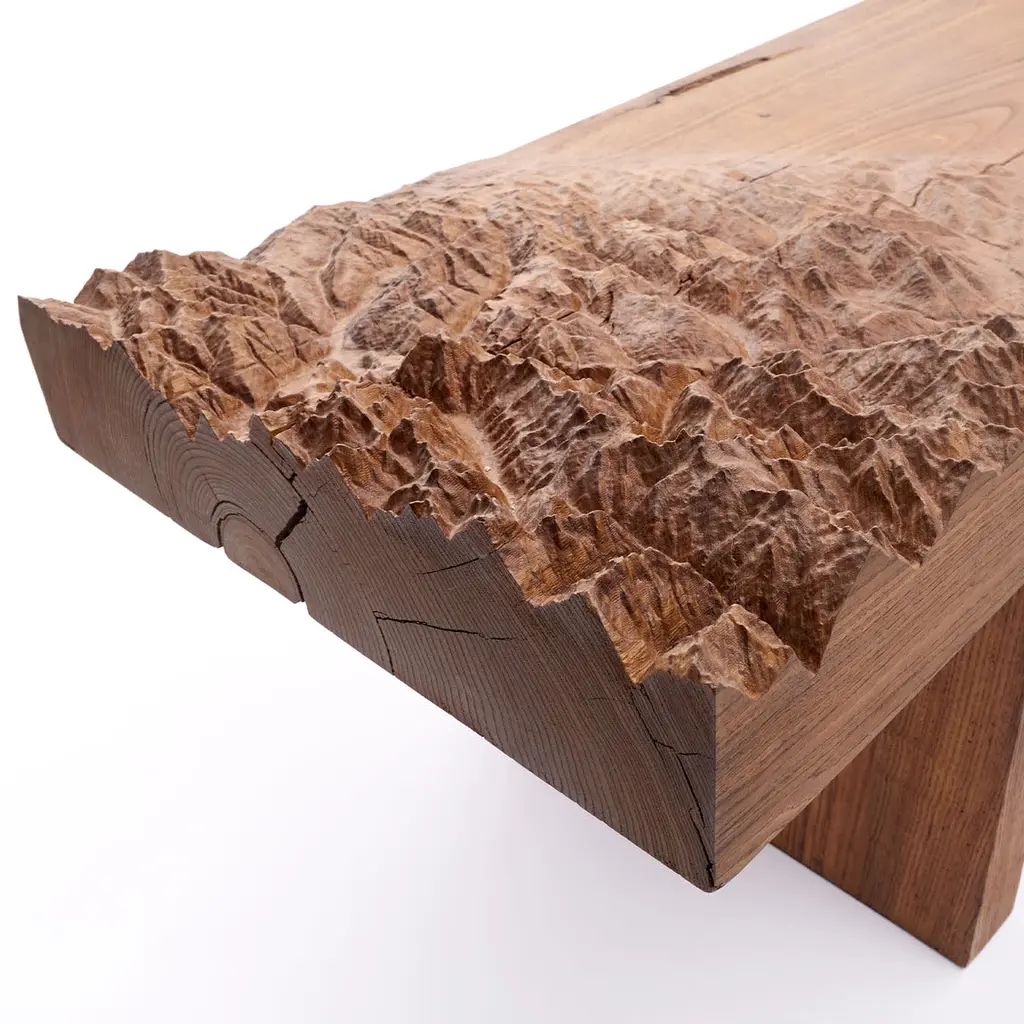 Belvedere is a unique bench that transforms the surrounding landscape into a dynamic piece of design. With a panoramic view of the nearby hills, the mountain slope is sculpted into the seat, transitioning from flat to three-dimensional, infusing the object with a sense of movement. Crafted from solid wood, it faithfully represents a real mountain range. Customers can personalize the mountain subject, topographic scale, and bench size to suit their preferences.