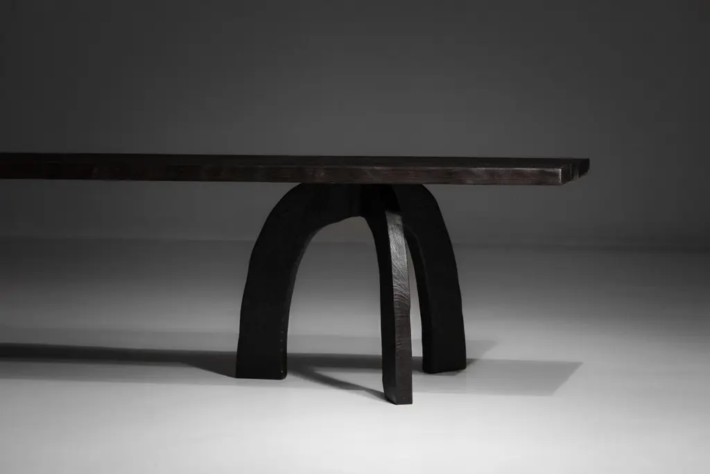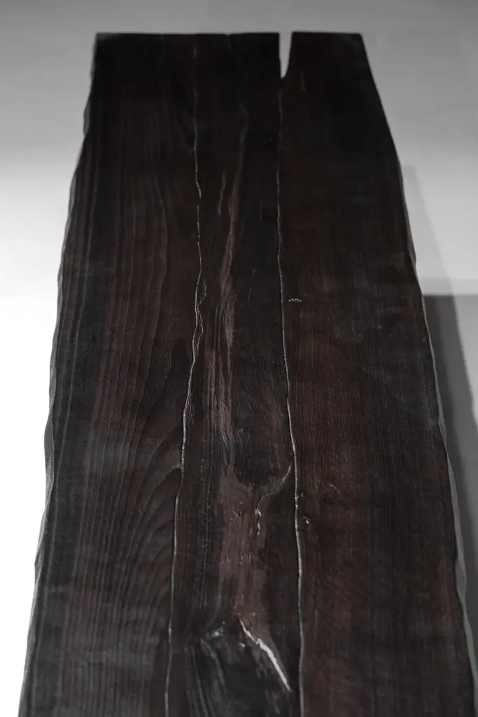 Long bench in burnt wood designed and handmade by the cabinetmaker Vincent Vincent in his workshop in Lyon. This bench can complete the collection already present on our gallery (tables, chairs, armchairs...) for a unique rendering.Designed with sturdiness and comfort in mind, each unique and numbered piece is handcrafted in solid beech wood with a "burnt wood" finish to make them rot-proof, protect them and reveal the wood grain. Possibility to adapt the length of the bench on request.