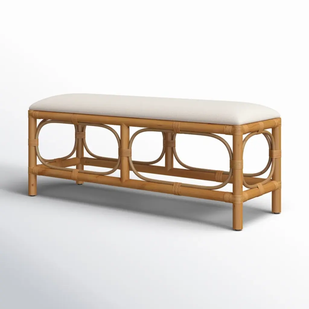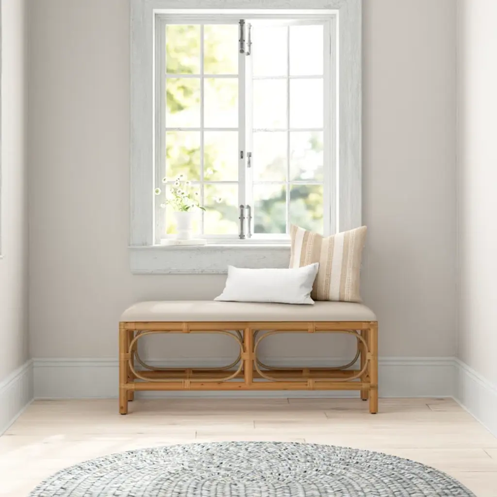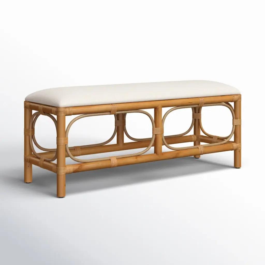 A refreshing coastal accent featuring a crisp white textured fabric, over a naturally finished solid wood base with rattan-wrapped accents. Perfect at the foot of a bed or as additional family room seating.