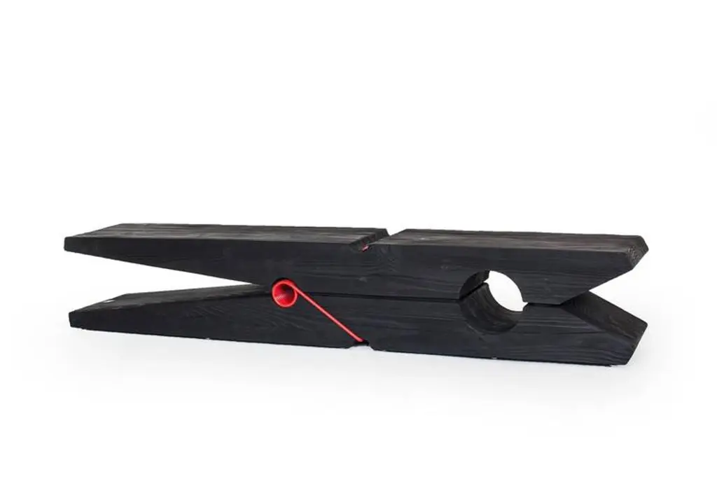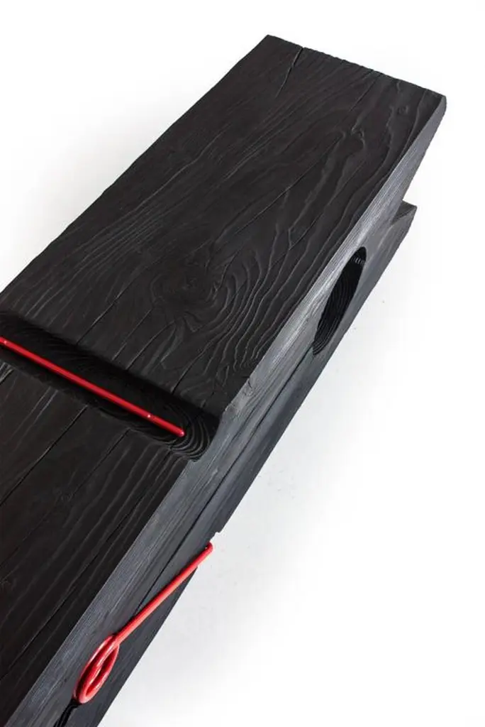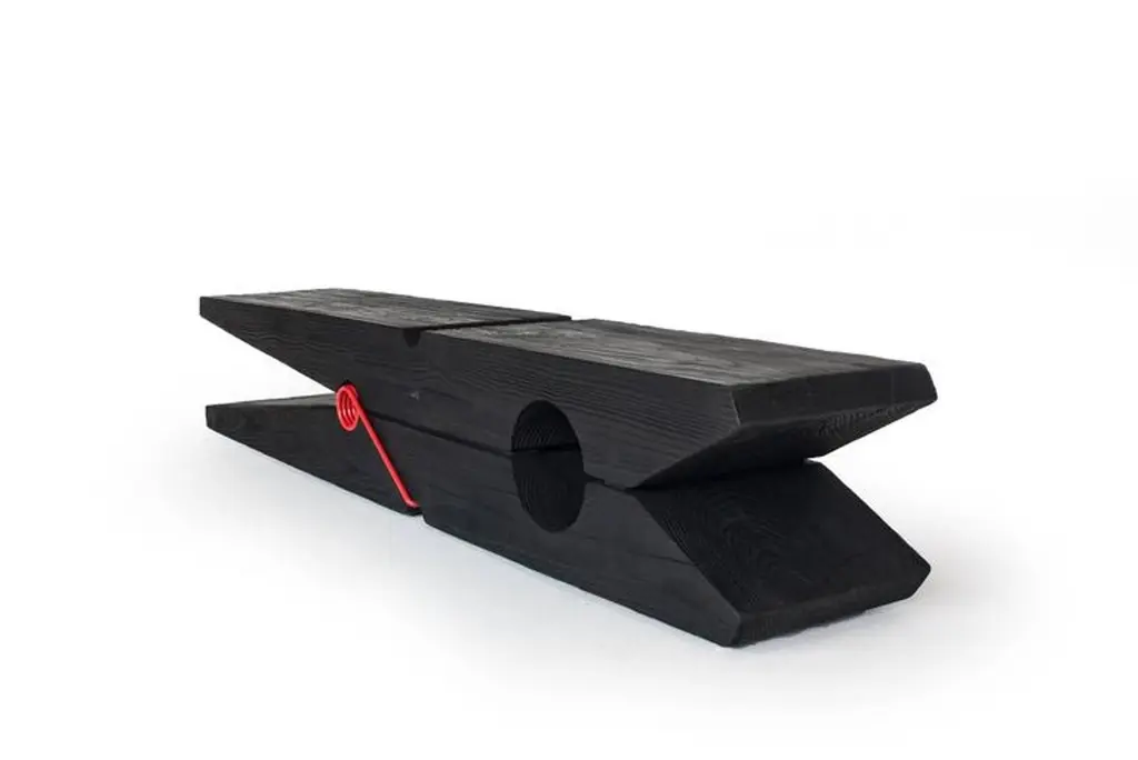 Bench Clothespin in solid natural black burnt cedar wood,with red metal mechanism. Treated solid wood with wax with natural pine extracts.L239,4xD45xH43cm, price: 10900,00€L190xD45xH42cm, price: 9400,00€L140xD39xH40cm, price: 8300,00€.Solid cedar wood include movement, cracks and changes in wood conditions, this is the essential characteristic of natural solid cedar wood due to natural settlement and different environmental conditions.