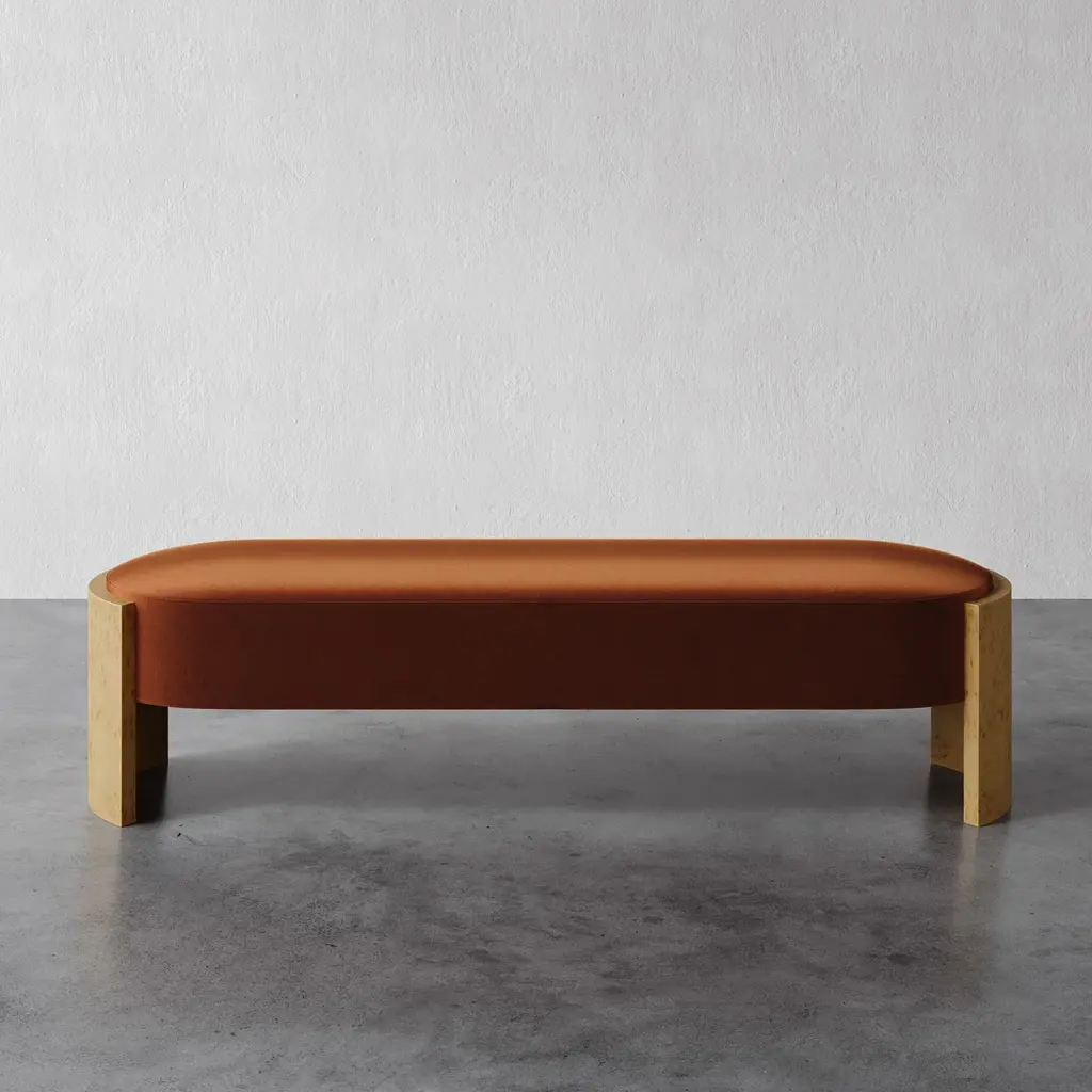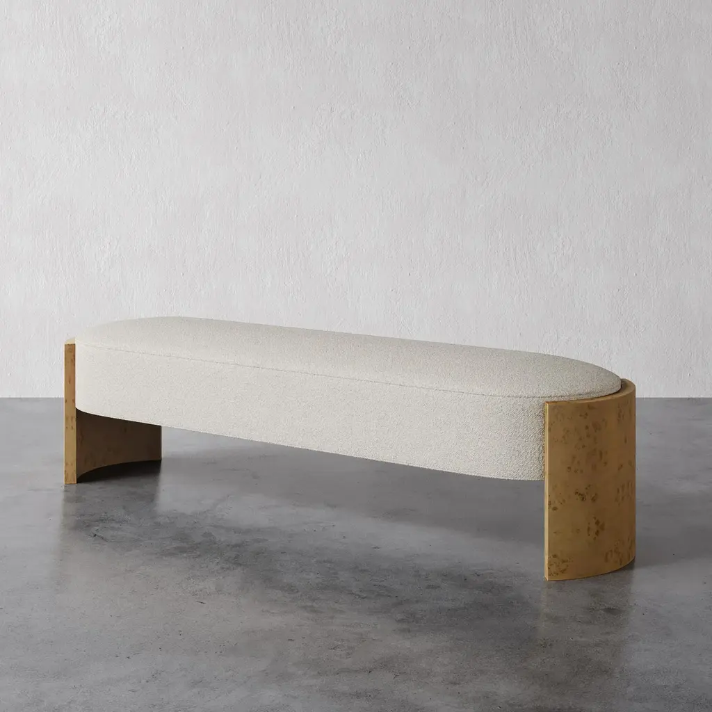 The Benoit Bench features a versatile curved shape, perfect for additional seating in an open-plan living room or as a centerpiece in a hallway. Its gorgeous curved Maple burl legs hug the deep bench seat, which is offered in a variety of luxe fabric options. This bench seamlessly combines functionality with luxury design, making it a standout addition to any home decor. Ideal for enhancing both modern and traditional spaces, the Benoit Bench offers both comfort and a refined aesthetic to your interior.