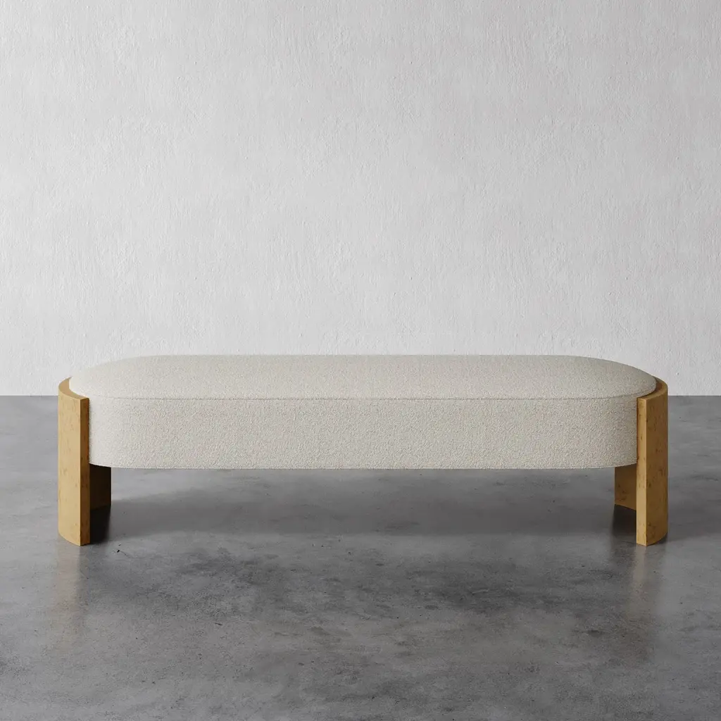 The Benoit Bench features a versatile curved shape, perfect for additional seating in an open-plan living room or as a centerpiece in a hallway. Its gorgeous curved Maple burl legs hug the deep bench seat, which is offered in a variety of luxe fabric options. This bench seamlessly combines functionality with luxury design, making it a standout addition to any home decor. Ideal for enhancing both modern and traditional spaces, the Benoit Bench offers both comfort and a refined aesthetic to your interior.