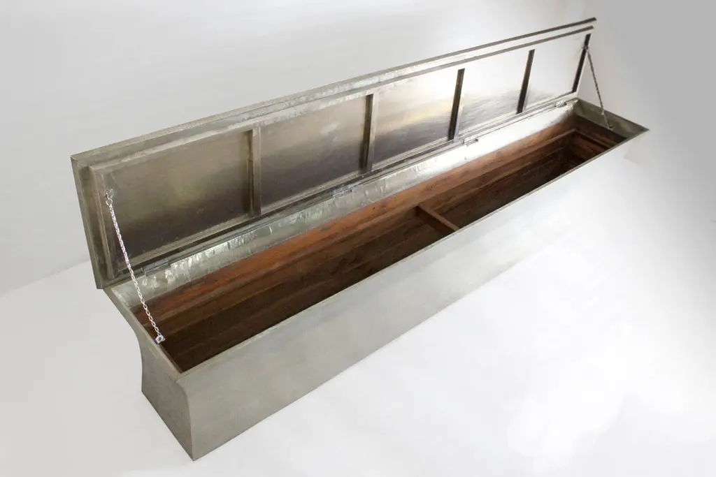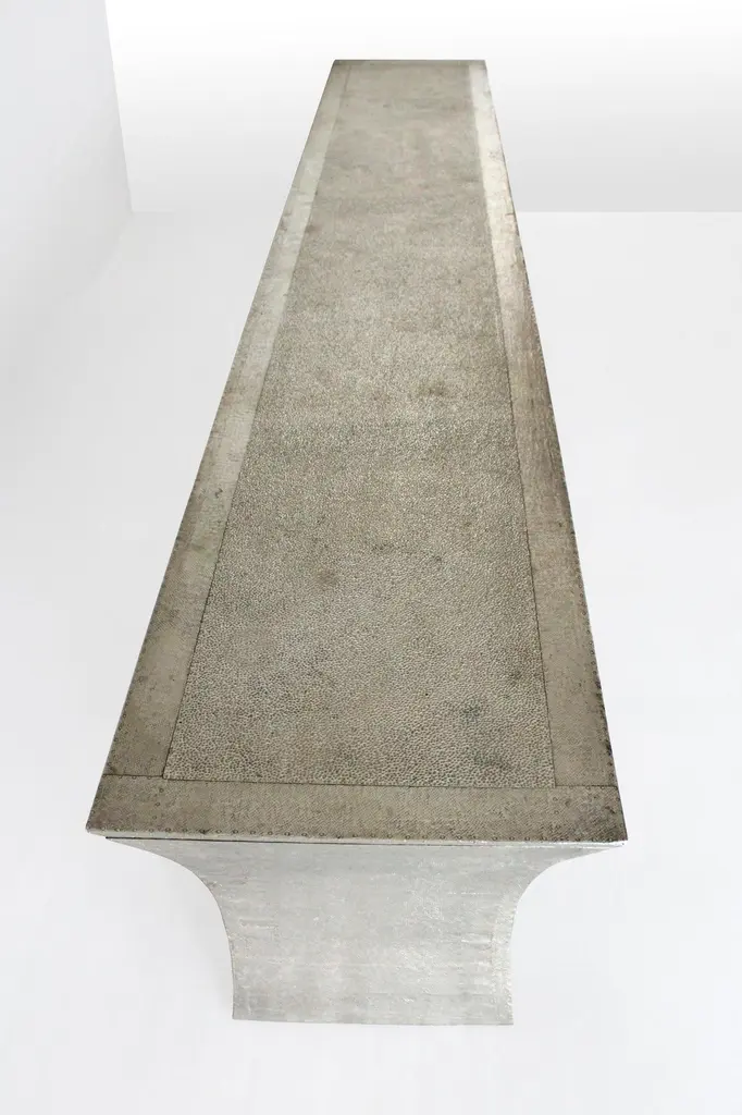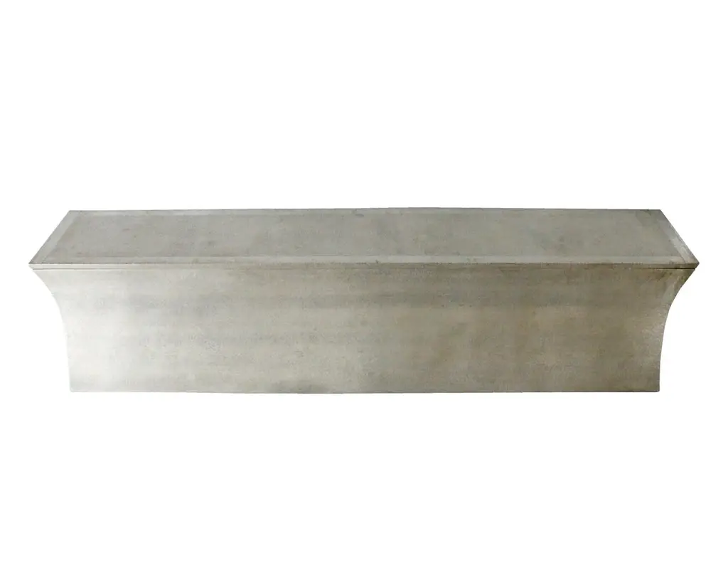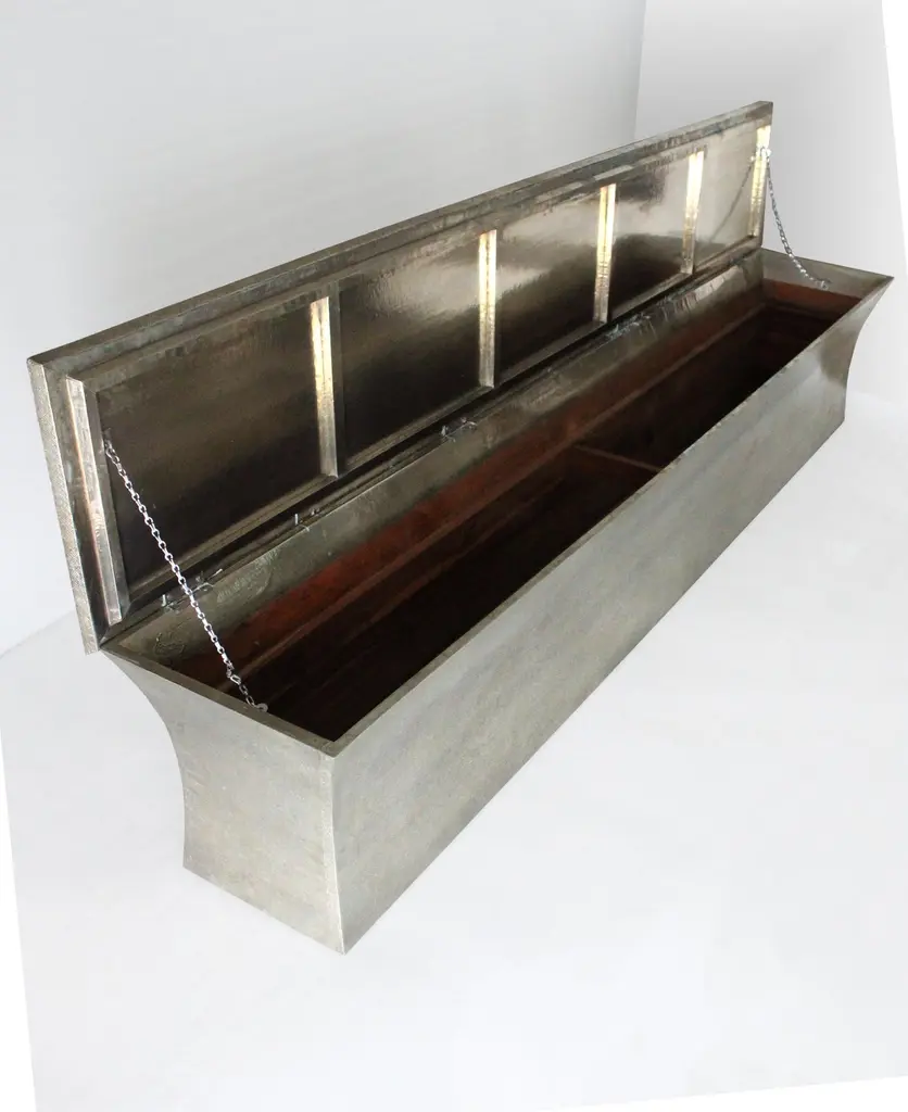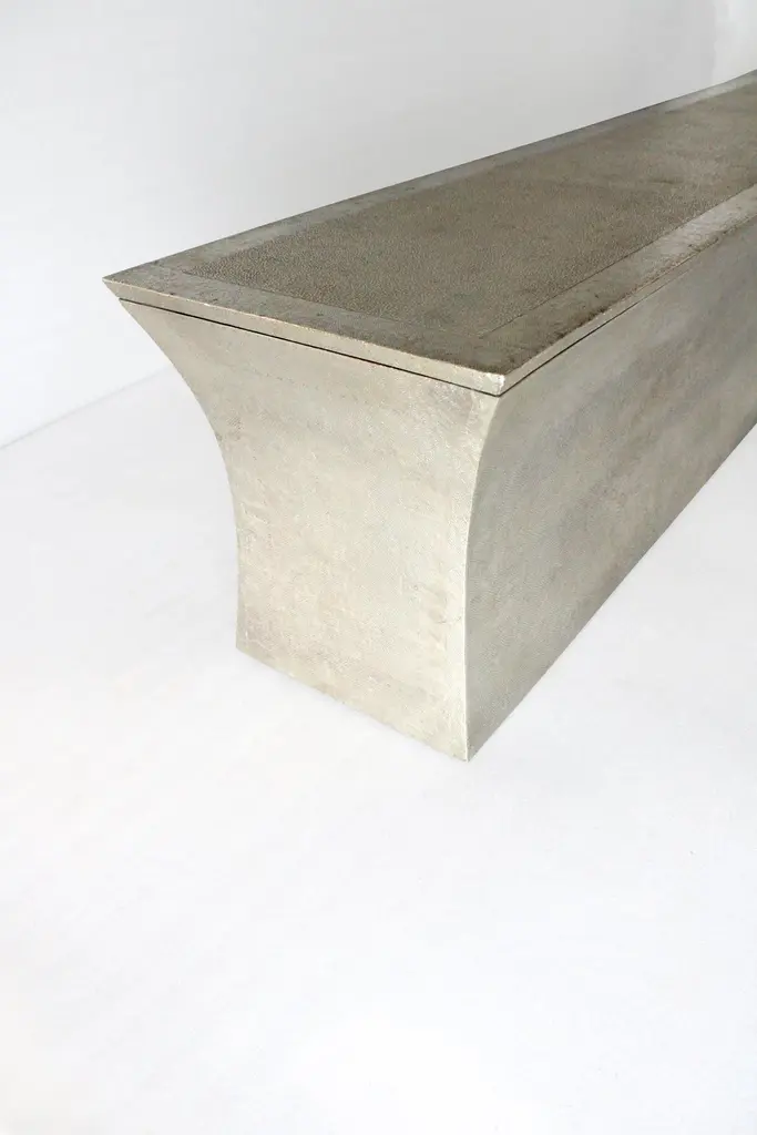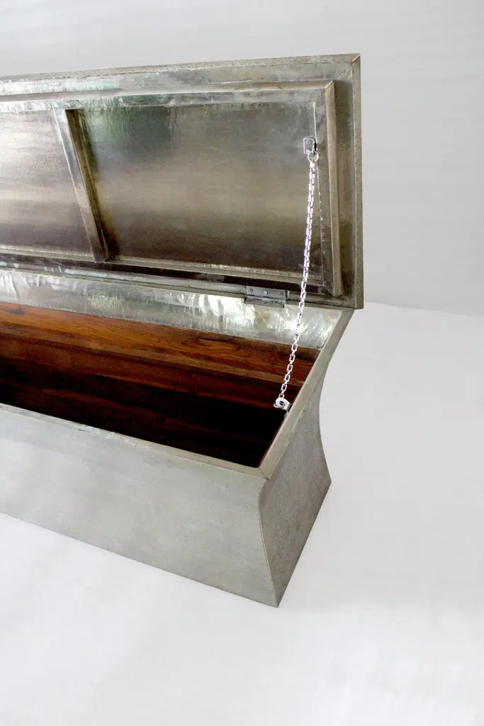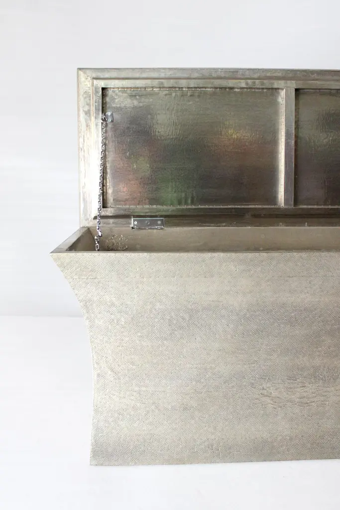 The traditional metal clad furniture he found in India inspired renowned designer Paul Mathieu to create this elegant and curvaceous storage bench. The arcing sides and top of this piece are hand carved from solid pieces of teak. The hinged lid opens to reveal a removable inset tray. Pattern makers trace and cut complex forms that will cover the bench from thick sheets of copper, brass or white bronze. Once the bench is joined together, it is meticulously encased in a tight fitting skin of white bronze, copper or brass. The metal finish will tarnish over time, but regular non-abrasive household metal polish can be used to restore the original luster. Big Vaisseau Bench in White Metal Over TeakSize- 16"D x 96"W x 17"HMaterials - White Metal, Teak, Cast, Hand-CraftedPlease note that moisture in air, sudden change in temperature and natural movement of wood over time causes the metal to wrinkle or bubble up. We use well seasoned, reclaimed teak and high quality marine grade MDF (wherever technically possible) to avoid and delay the above mentioned changes. However a perfect stability of metal cannot be guaranteed.Buyer Cancellation-The cancellation charge is 25% which increases to 50% if the production is started.Prices do not include shipping from India (for custom orders) or our MN warehouse (items from stock). That will be additional.