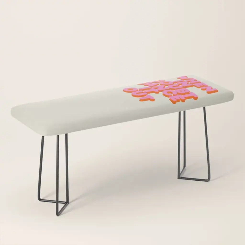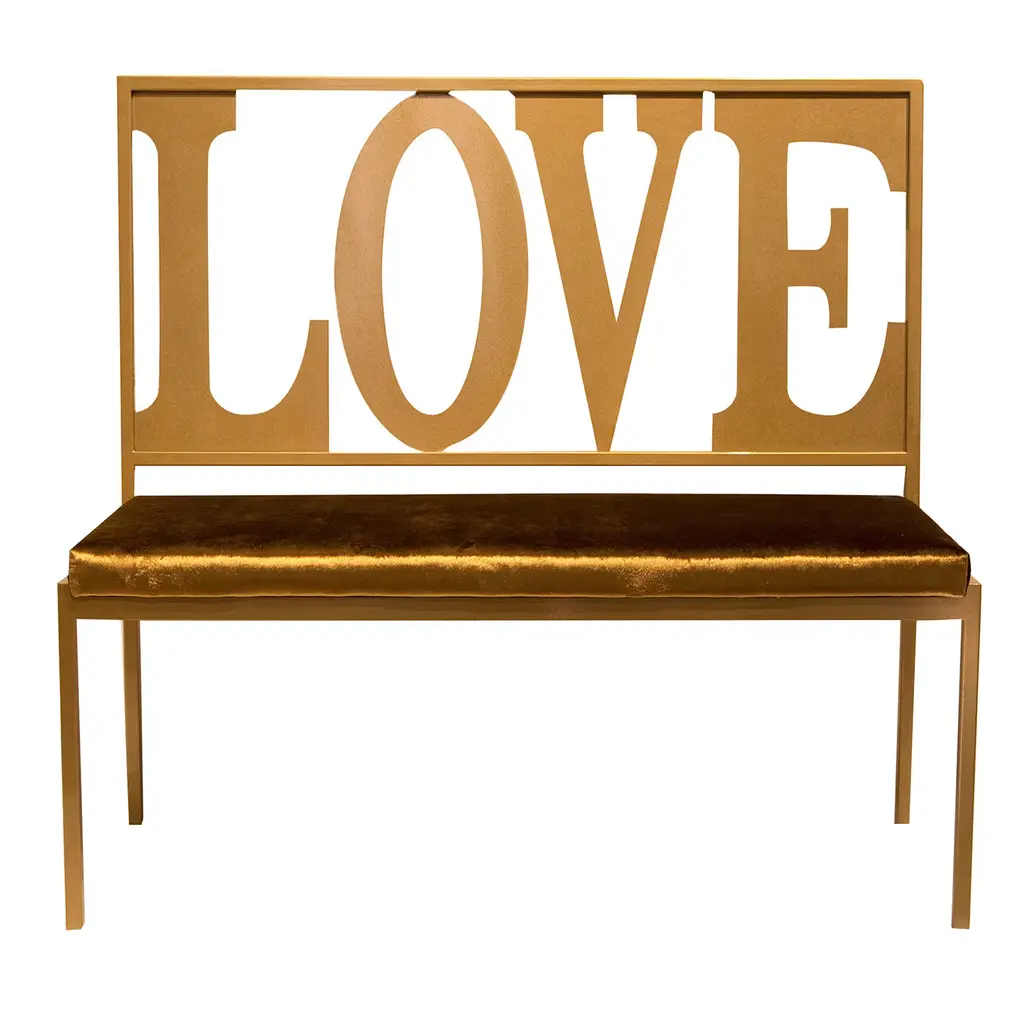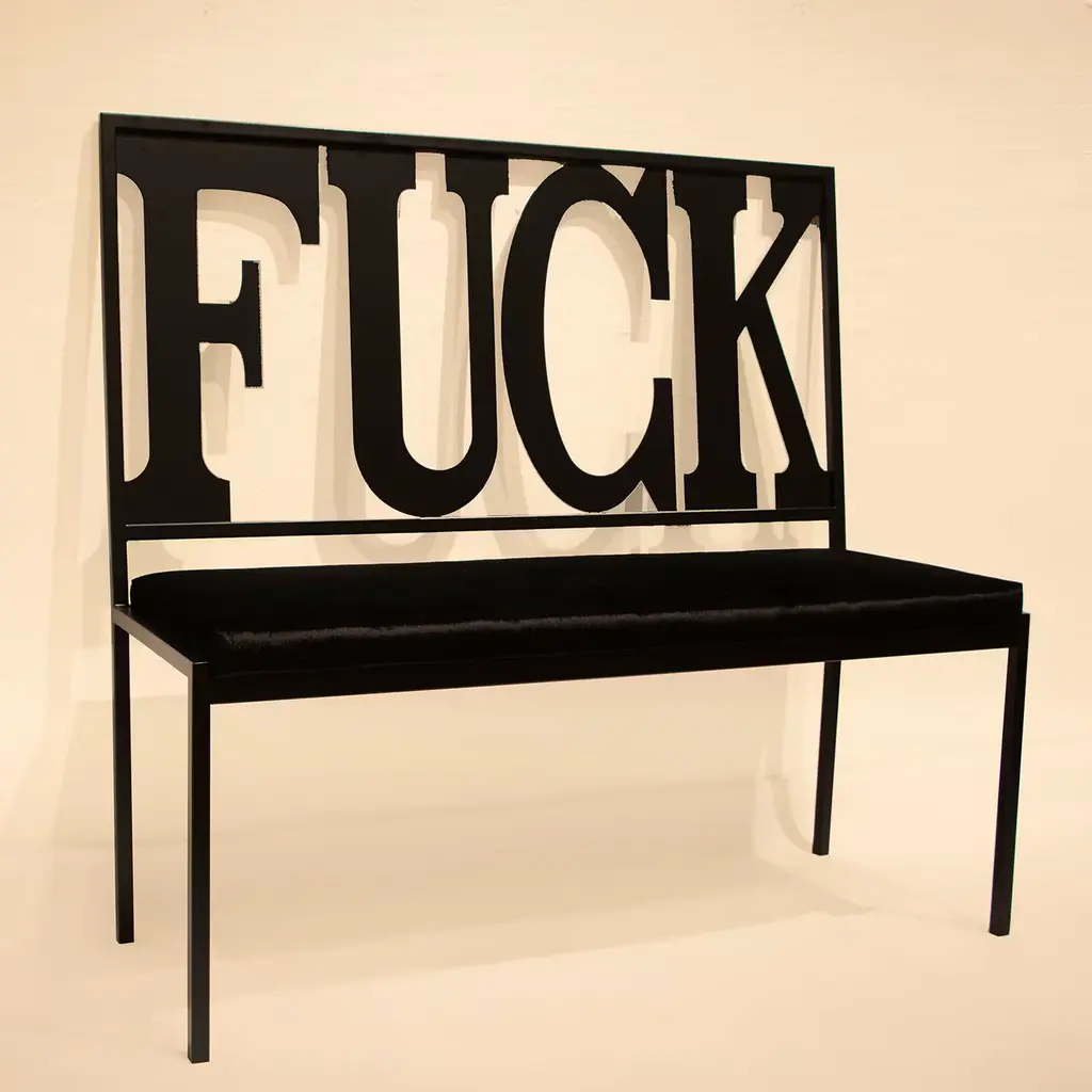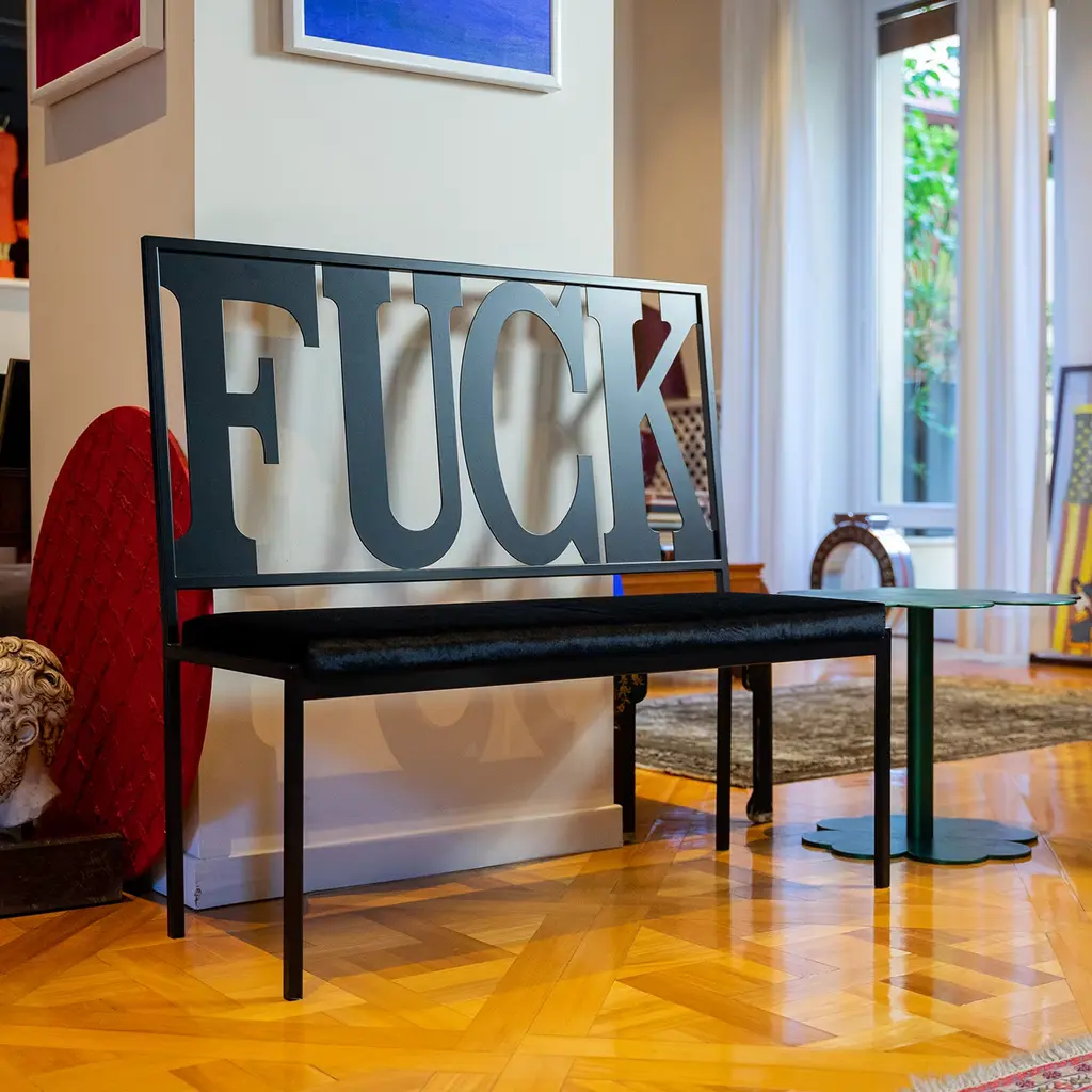 An unconventional piece of furniture for those who love daring styles with a strong personality, this bench features a total-black look with a slender iron frame and padded seat covered in soft velvet. The combination of these two materials creates an interesting text aesthetic, enhancing its most noticeable feature, the open backrest with four block letters that spell out the curseword. A piece that will certainly spark conversation among guests, this bench is entirely crafted by hand so slight variations are to be expected. Available also in gold with gold, blue, bronze, or gray velvet. Each piece is unique, due to handcrafting, slight changes may occur.