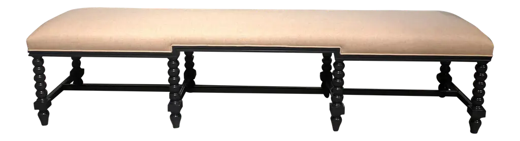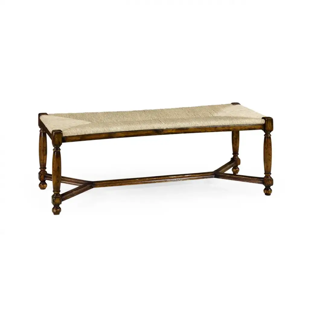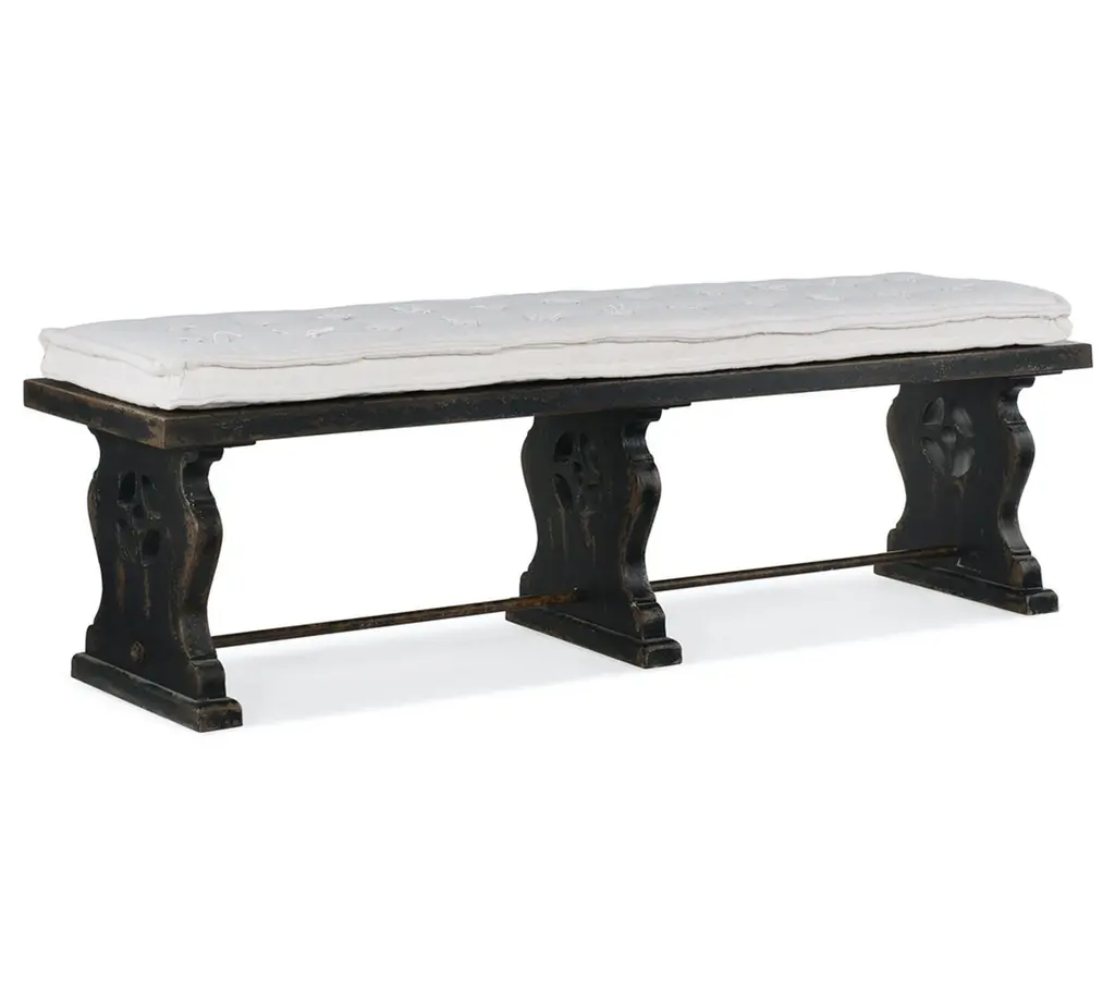 Inspired by rustic estates found across the Italian countryside, the Blandy Bench strikes an eclectic balance of farmhouse design and elegant details. Harp-shaped legs and a multi-layered finish gives it the warmth and appeal of an heirloom that's been passed down for generations. The cozy reversible cushion is blind tufted on one side, then flips to French ties on the other.