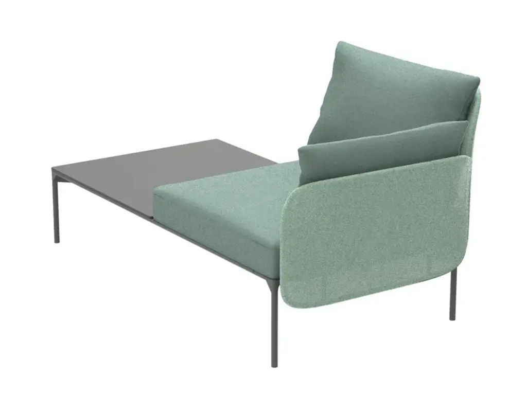 Bloom is a bench equipped with right or left shelf, with aluminium frame, upholstered and covered in fabric. The collection includes poufs, sofas, small sofas and different armchairs, designed to create a seating system.