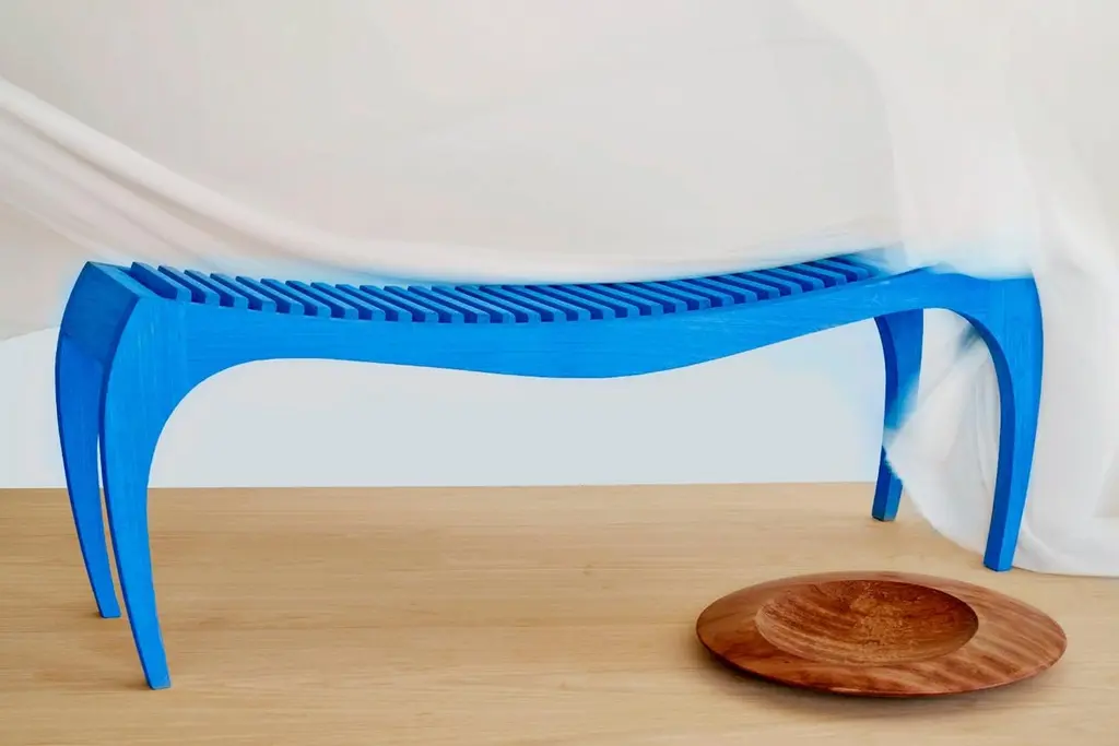 Blue bench rumbo by Jean-Baptiste Van den HeedeUnique piece signed and numberedDimensions: L 118 x H 42 x W 31 cm Materials: solid woodJean-Baptiste Van den Heede defines himself as a cabinetmaker-designer and an artist of academic training and family tradition. He has achieved unique designs of national and international prestige and has several awards in avant-garde furniture.Born in Argentina in 1966, from an Argentine mother and a Belgian father. At 5 years of age he and his family moved to Belgium.To train as a wood professional, he first studied 4 years of carpentry. Then he continued training in cabinetmaking and carving for 5 more years. Always in search of contributing something more to his trade, he studied furniture and antique design, culminating this with the study of Sculpture at the Royal Academies of Fine Arts in Liège (Belgium) and graduating with honors.Work the stone, the wood and experience the forge. From the beginning it is directed towards a search for signs, abstract writings and unrealistic figures in analogy with other “Primitive” cultures. He taught drawing and sculpture in Brussels at the private school “la main et l´ esprit” As well as summer courses in Liege (Belgium) “les ateliers d´art contemporain”.In 1995 he went to Barcelona where he taught and investigated the reliefs of different supports such as trees, floors, and especially sewer covers.He searched again analogies between current art and Prehistoric, African art, etc.Participated in several exhibitions both at the artistic level and avant-garde design.In 2002, he moved down to Albacete and then to a town in the province where he still works.It is defined as “a search engine without haste or guidelines.” He says: “I only work when I feel a strong and positive inspiration invade me, an energy that I capture from matter, from the air and that I return doing the work until I feel a connection with it.”Private workshop of contemporary art in Letur (Albacete) until 2009.He currently works in his workshop-studio in the Sierra de Madrid (Guadalix de la Sierra) following his career as a cabinetmaker-designer and artist while teaching his trade to students interested in wood.