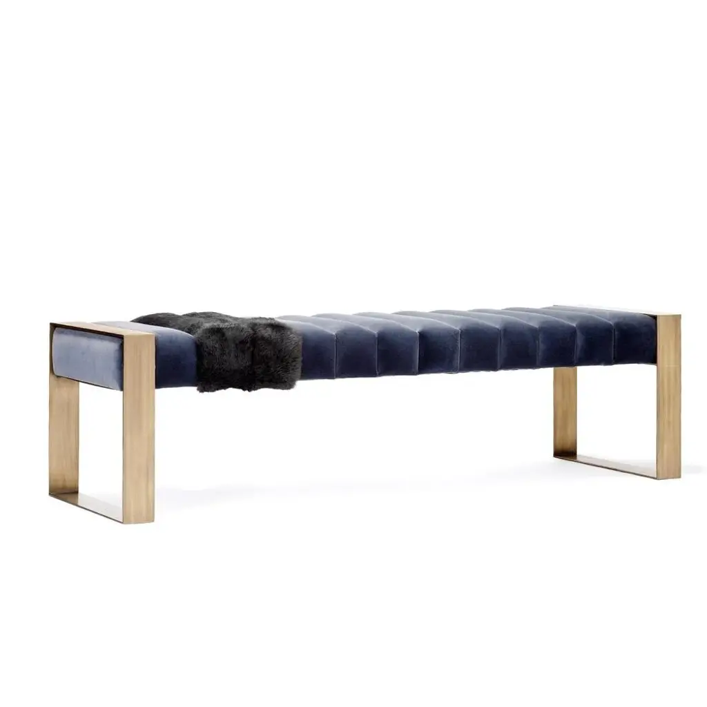 Blue dawn bench by duistt dimensions: w 160 x d 50 x h 45 cm materials: duistt fabric, fur and brass the dawn bench, crafted with great attention to detail, is a statement design piece.