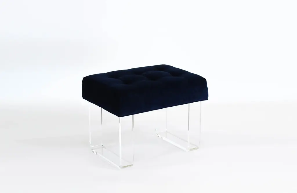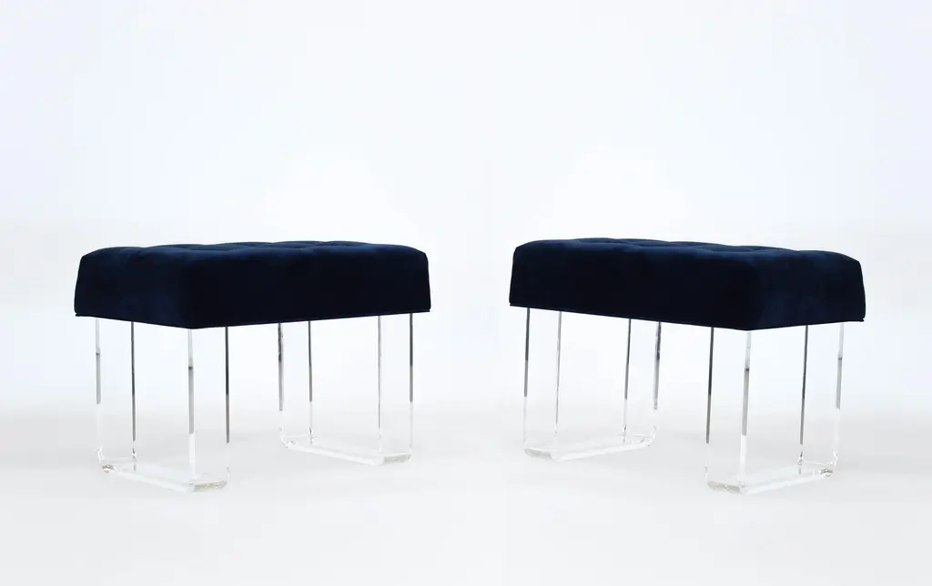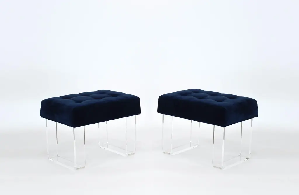 Elegant pair of custom waterfall acrylic benches with upholstered cushion in a lovely navy blue velvet textile Each acrylic leg was individual cut, bent and hand-polished to give the legs its light and luxurious finish Acrylic is 3/4"Thick, the cushions are upholstered in a lovely navy blue velvet Dimensions: 22"Width x 16"Depth x 17.5"Height If you have any question, please let us know