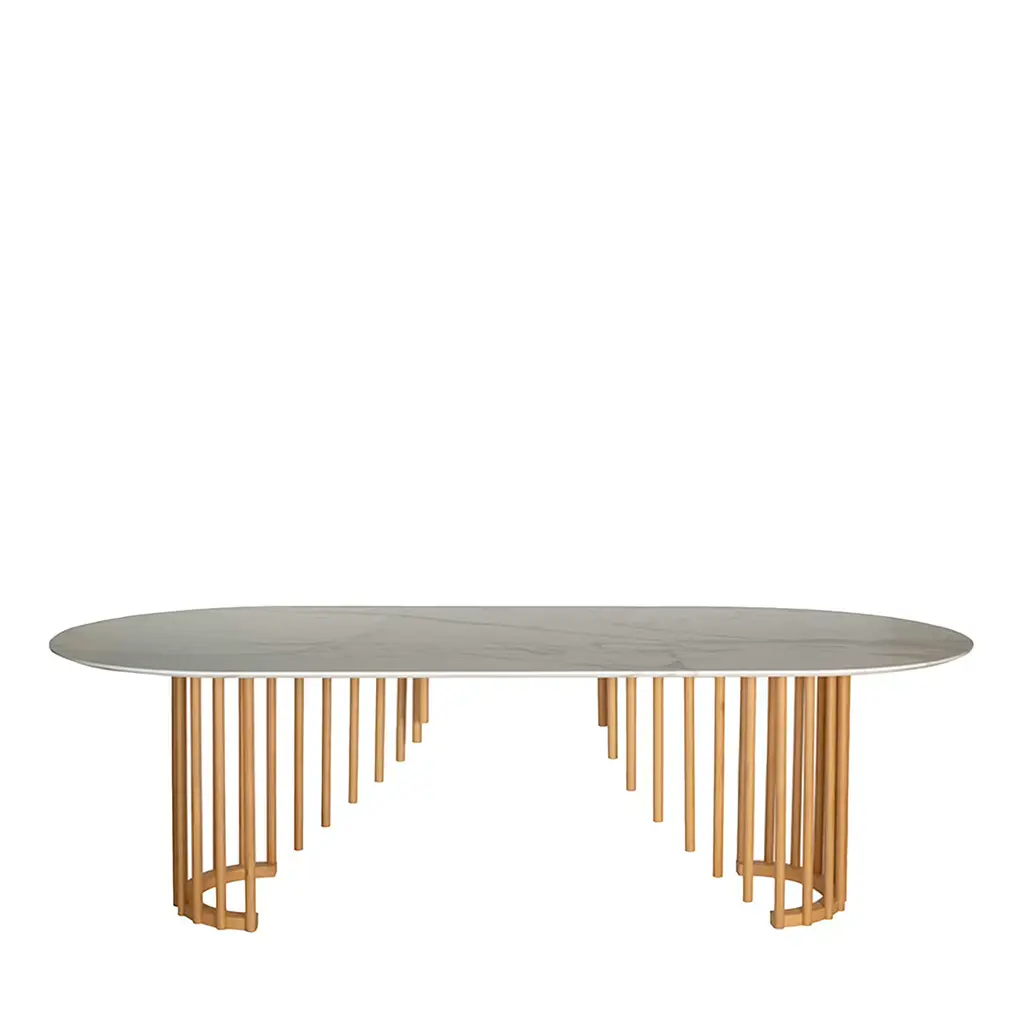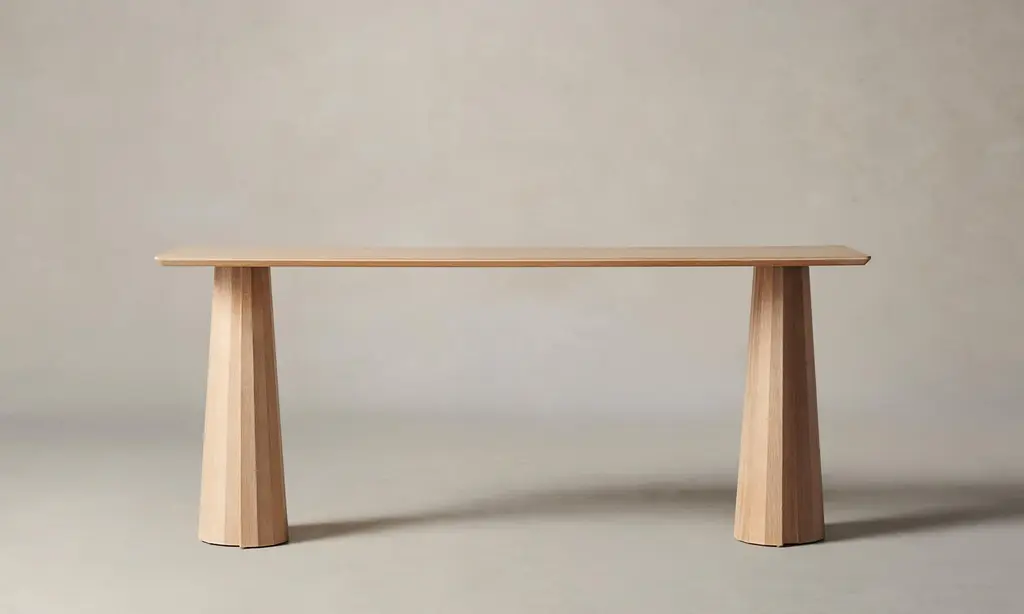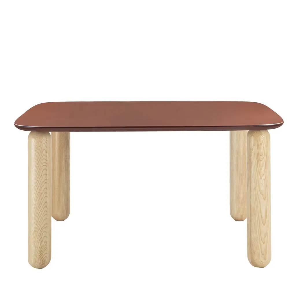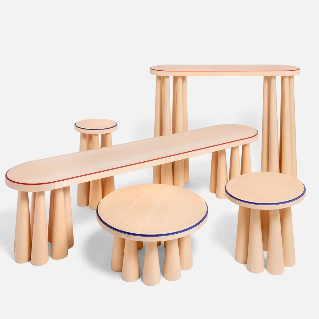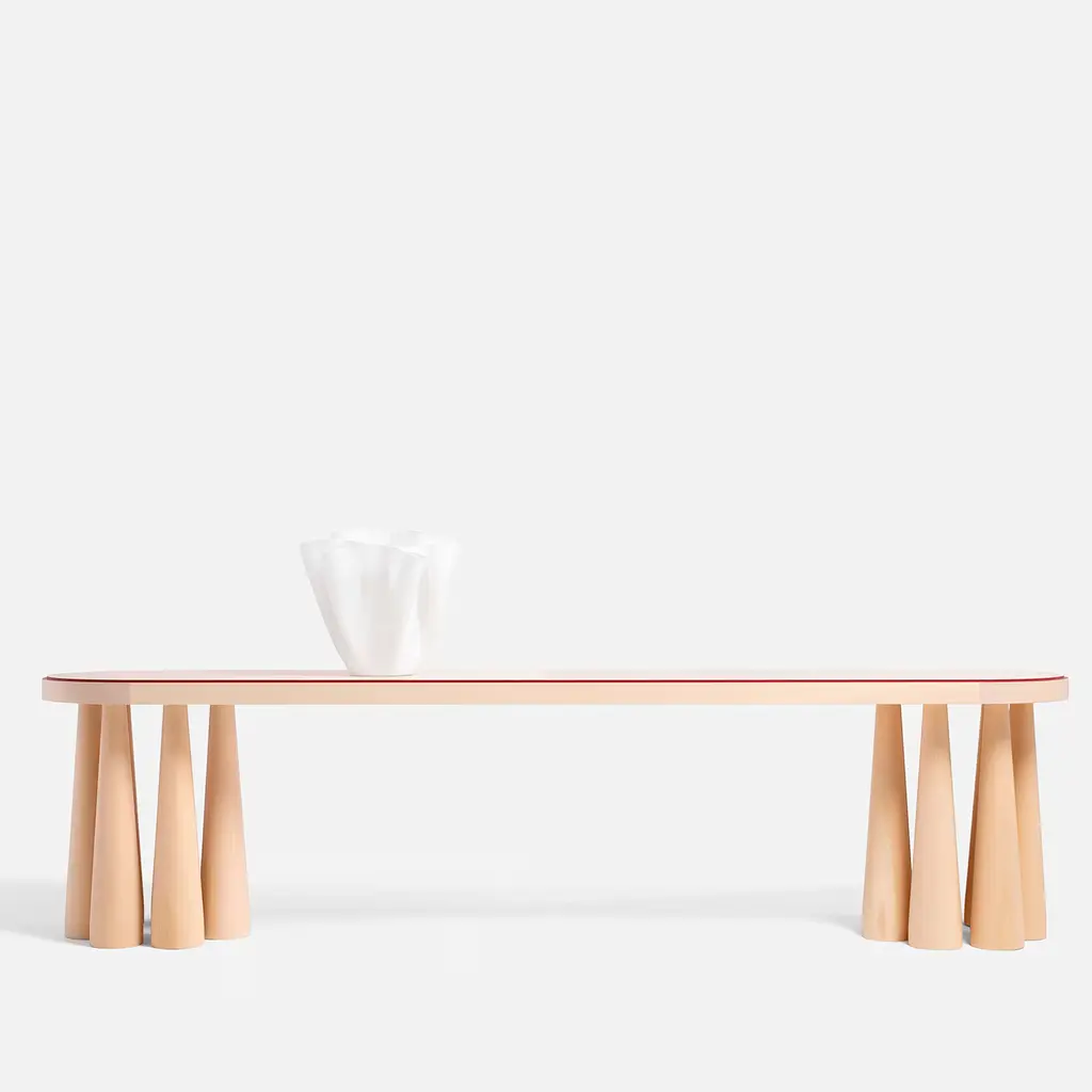 The Bogdan collection is born from a single trunk of linden wood, generated by one specific element. A mono-materic piece of furniture, characterized by a distinguished color line that defines its perimeter and shape. The cones at the base, arranged in circle to create a single visual element, support the top that is configured as the unifying part of what raises it. The colored milled-edge ribs, embellish and complete the top, creating, together with the legs, plays of chiaroscuro all around.