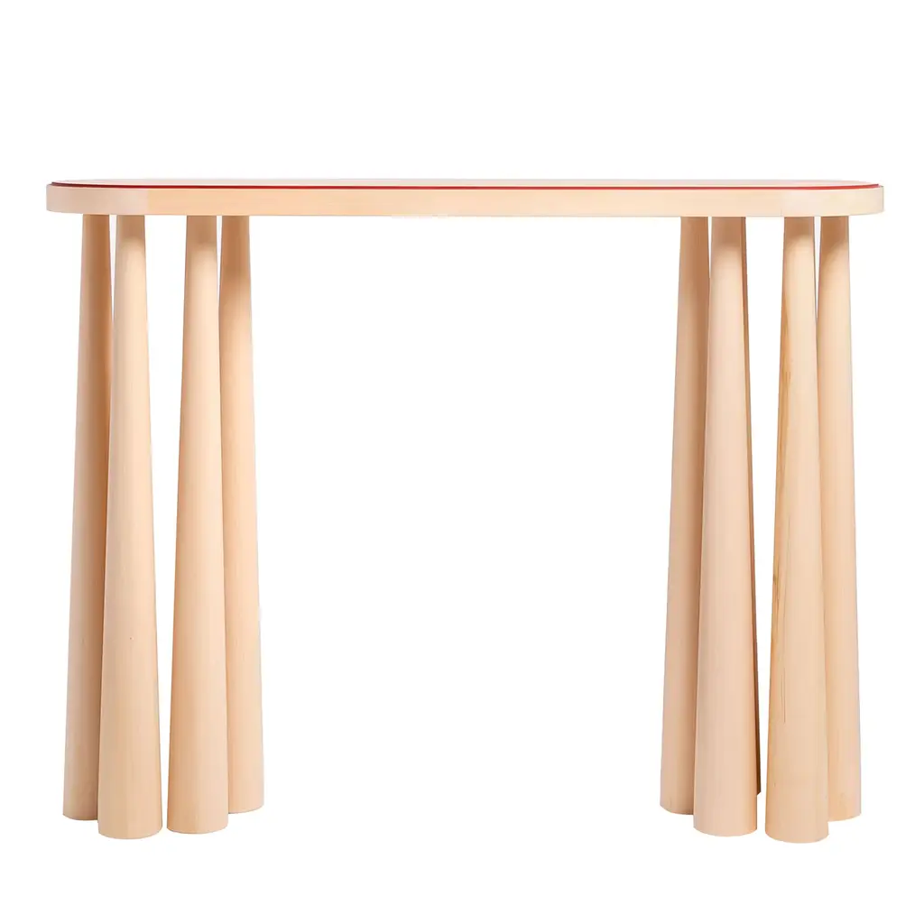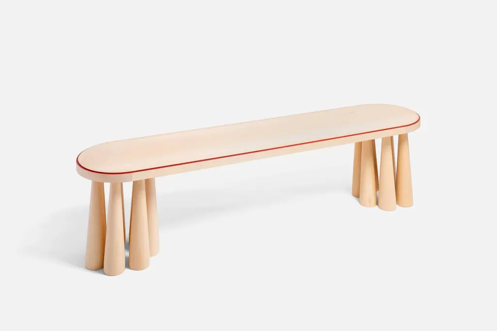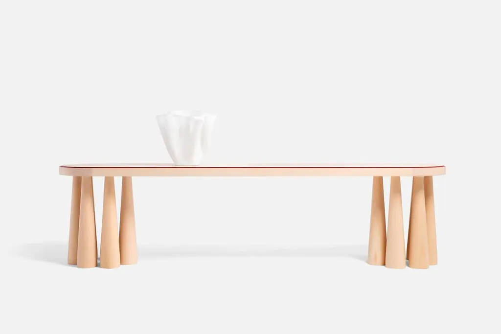 Bogdan bench by Studio Intervallo.Dimensions: W 180 x D 40 x H 46 cm.Materials: LINDEN solid wood, with colored decoration on the circumference.Other types of wood available on request.The Bogdan collection is born from a single trunk of linden wood, an entire family generated by one specific element.A mono-materic piece of furniture, characterized only by a distinguished color line that defines its perimeter and shape.The cones at the base, arranged in circle to create a single visual element, support the top that is configured as the unifying part of what raises it.The colored milled-edge ribs, embellish and complete the top, creating, together with the legs, plays of chiaroscuro all around.studiointervallo creates furniture and interior design. All its creations are painstakingly researched with a thorough use of full and empty spaces.For this reason, it could only exist between the fullness of the city of Milan and the emptiness of the countryside around it, in a place which is also ideal for meditating, as well as a stimulating anteroom to creative thinking.This unusual location’s aura successfully blends with the projects of studiointervallo, thus enriching them with nature in a final true epiphany which is the very soul of each single creation.Founded by Andrea Ghisoni, the studio pursues the perfect blending of essential lines with the brightness of the shapes and and the nobility of true craftsmanship; the overall goals would be to just make people happy.