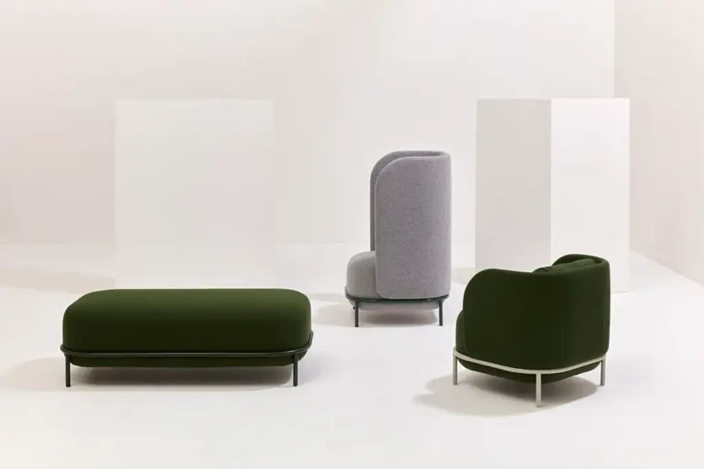 Bold 0C94 is a padded bench with a metal frame.Bold is an upholstered furniture collection designed by Studio Pastina, featuring generous volumes and conceived to bring a new level of comfort to contract spaces.Supporting the tall seat—shaped in reference to classic French macarons—is a painted steel ring that serves as a distinctive design element.The collection is complemented by side tables and accessories such as the high backrest, ideal for creating private corners within larger environments.
