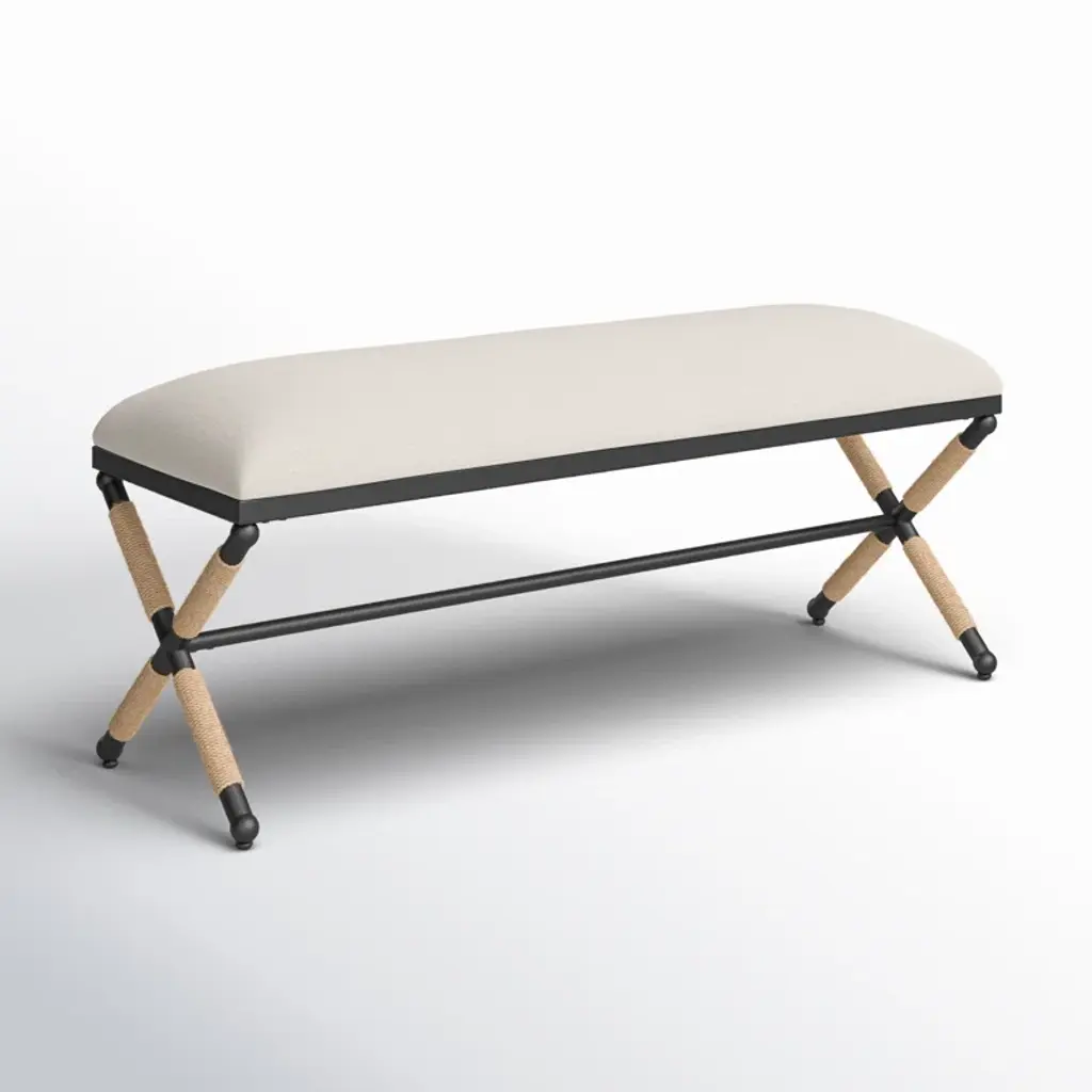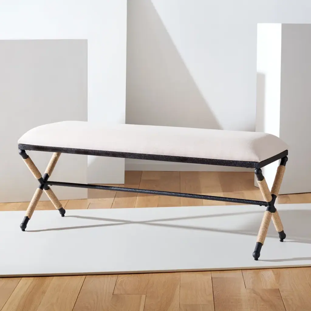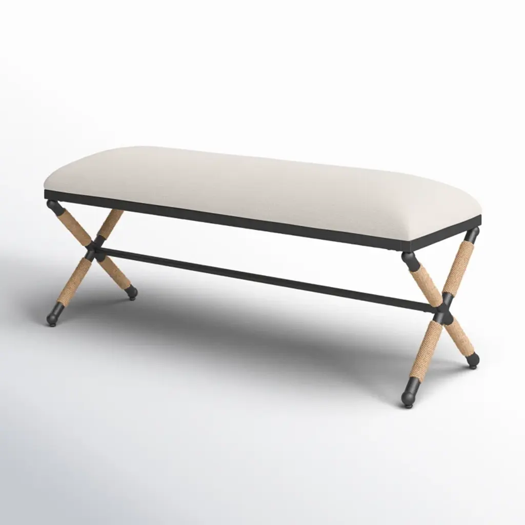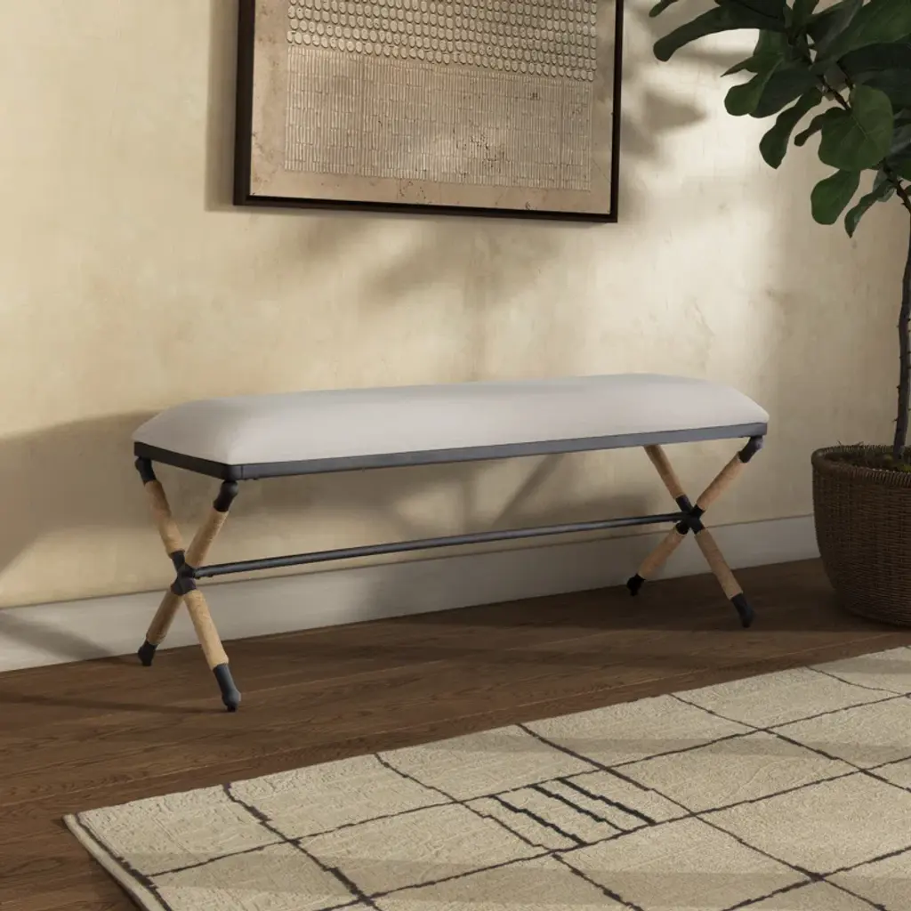 This bench brings style and seating to your entryway, hallway, or living space. It's wrapped in neutral-hued linen upholstery and stands on a cross-legged metal base with a dark finish. This bench features a clean-lined rectangular cushion top for extra padding whether you're sliding on your shoes or settling down with a book. Natural hemp wrapped around the base offers an organic touch and a mixed-materials look, complementing design schemes from industrial to contemporary. Best of all, this piece arrives fully assembled.